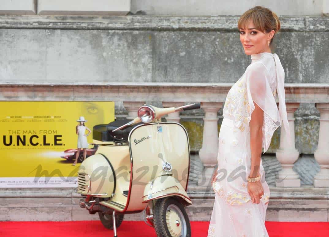Jacqui con un vestido blanco, que podía valer perfectamente como traje de novia, posó feliz ante las cámaras con su recién estrenado marido, subidos en una moto “Vespa”, muy vintage, un photocall original seguramente pensado por el director.