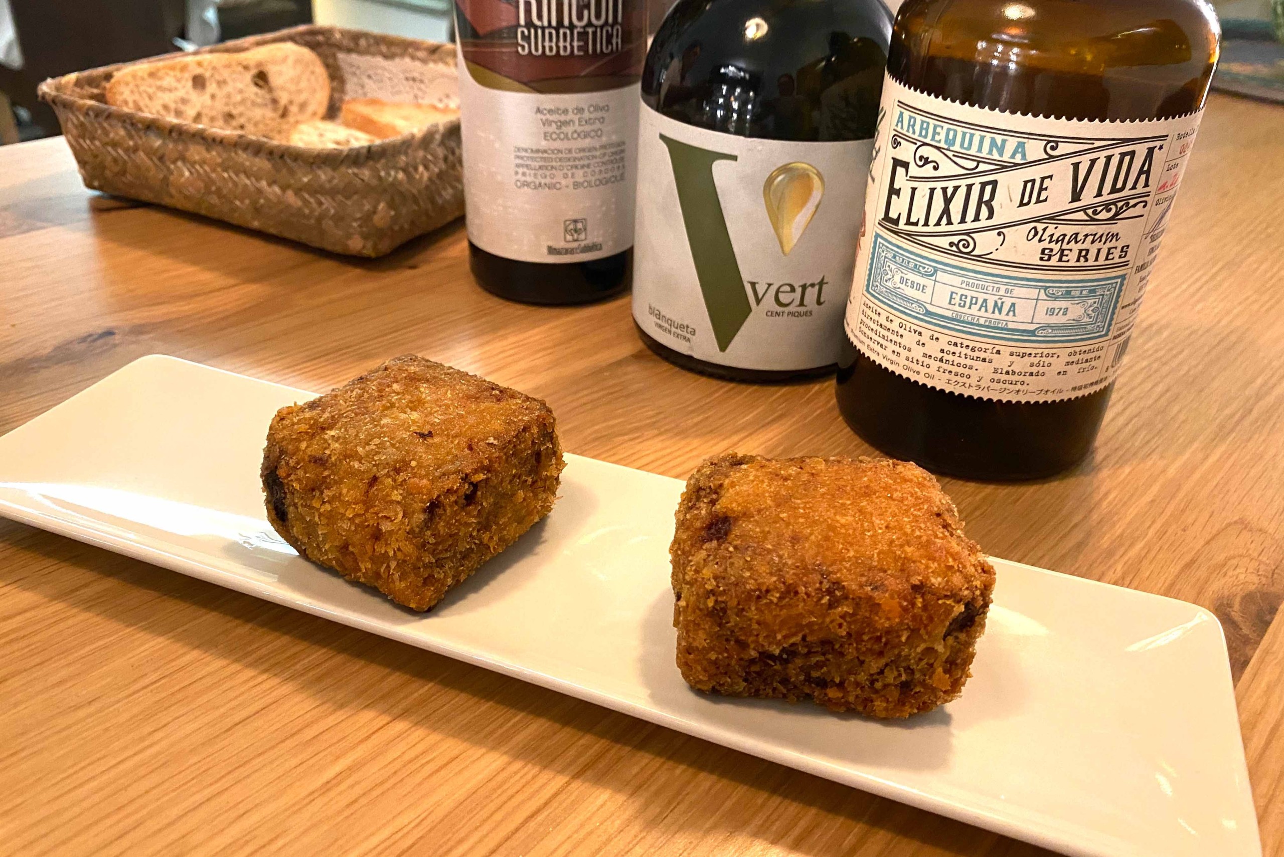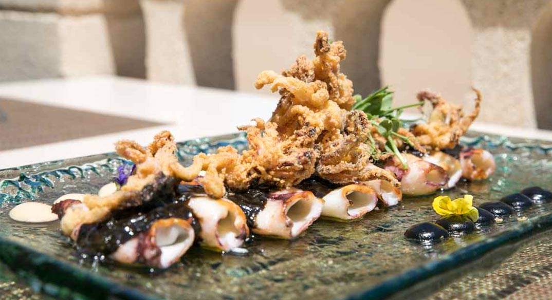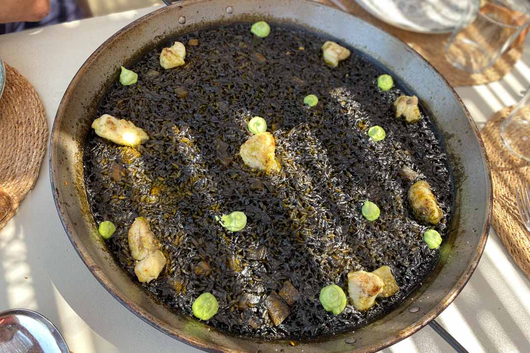 Continuamos con unos “Crujientes del mar con dúo de “all i oli””, una versión moderna del calamar a la andaluza, acompañado de dos tipos de mayonesa que aportan cremosidad y profundidad al plato. Para terminar, “Arroz negro con rape y “all i oli” verde”, un arroz meloso con un sabor profundo y marino, complementado con la suavidad del rape y el toque fresco del “all i oli” verde.