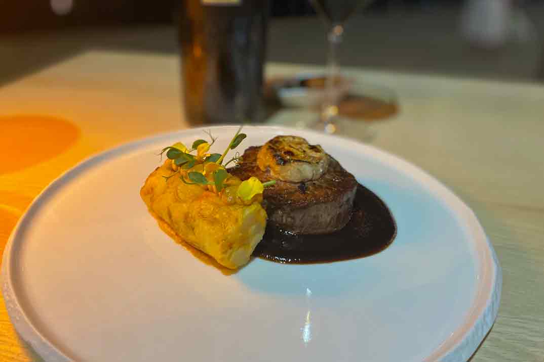 Nosotros degustamos una selección de platos que reflejan la esencia de la cocina de Vicente Jiménez, como la “Ensaladilla con langostino, salsa de encurtidos y chips de pimentón”, una reinterpretación fresca y sabrosa de la clásica ensaladilla, con un toque ácido y crujiente que realza el sabor del marisco; “Mejillones estilo Thai”, una fusión de sabores orientales con el producto local, donde los mejillones se bañan en una salsa aromática y especiada que despierta los sentidos.