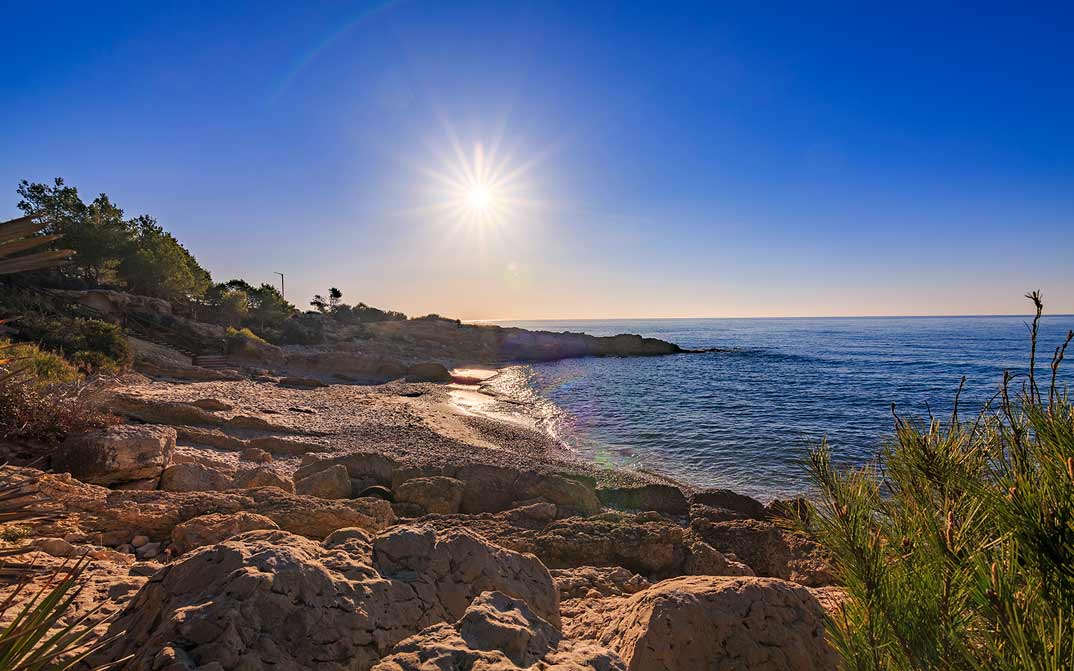 Los pinos llegan casi hasta el mar en diferente lugares y crean pasillos producidos por el aire. Creando un paisaje idílico al lado del mar. Nos perdemos por estos pasillos perfectamente construidos y vamos viendo distintas calas hasta llegar a Cala Ribamar que está dentro del parque. El paseo merece la pena sobre todo para poder disfrutar del atardecer en este lugar tan mágico.