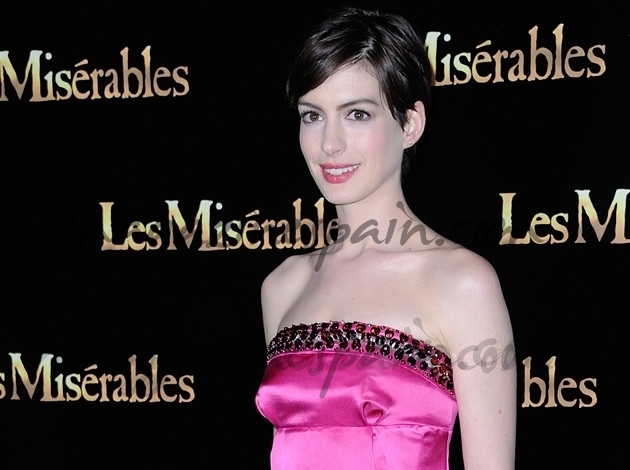 Con un espectacular vestido rosa fucsia con los hombros al descubierto , la actriz Anne Hathaway lució espectacular en el estreno de Los Miserables en la ciudad de las luces .