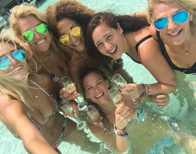 Con un velo de novia, con la leyenda en una banda rosa, “Futura novia”, luciendo en bikini su escultural cuerpo, brinda con champan con sus amigas y disfruta de las transparente y cálidas aguas de las Islas Maldivas.
