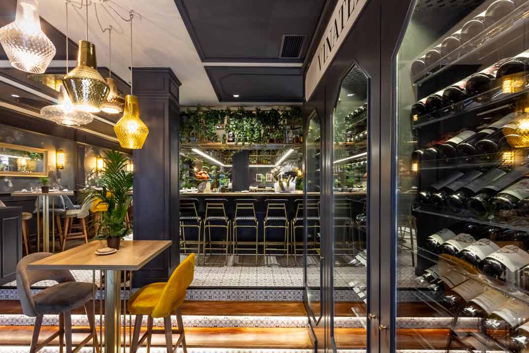 Barra y Mantel es un espacio polivalente con diferentes rincones: A la entrada, una gran barra central y mesas altas te dan la bienvenida, junto a la bodega expuesta en una amplia vitrina.