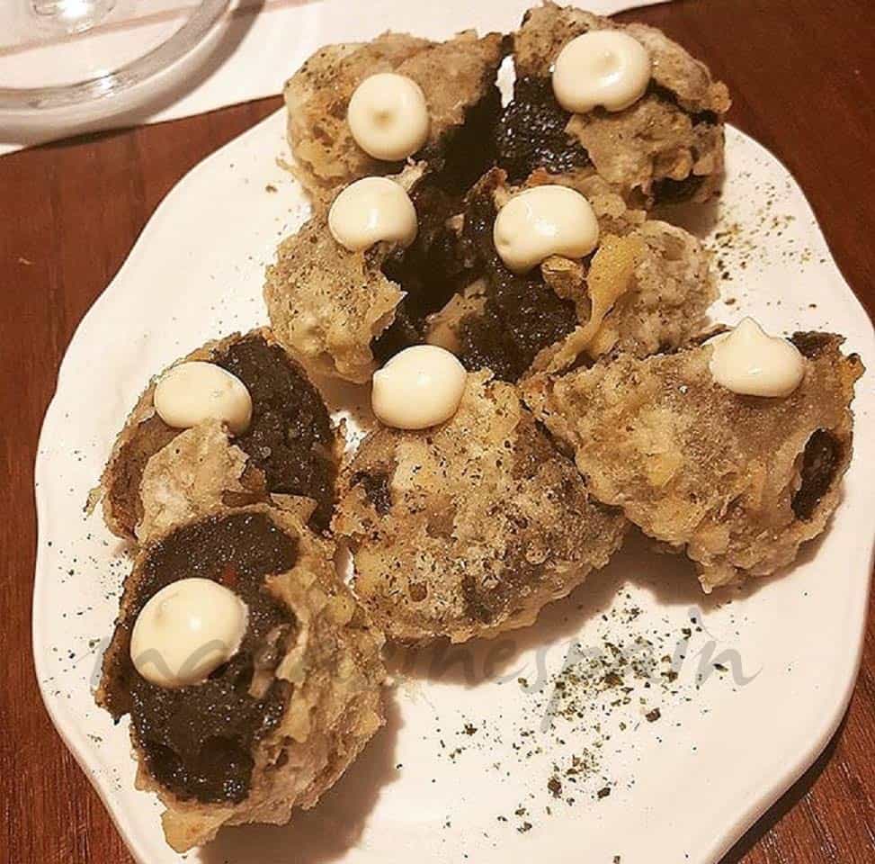 Para ir abriendo boca, nos decantamos por unas “croquetas cremosas de tinta” hechas con la tempura típica de la fritura andaluza y con el tradicional guiso de chipirones en su tinta… ¡El mar en nuestras bocas!! y una “tortilla de camarones CROCHÉ XL”, fritas al momento… Son grandes, perfectas para compartir.