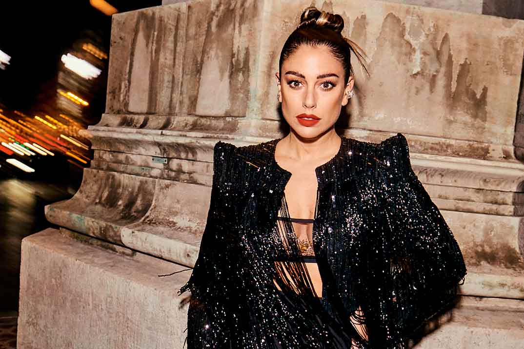 Un look digno de las mejores veladas, creado por Freddy Alonso, en el que su fusiona a la perfección fusiona elegancia, sofisticación y mucha sensualidad. Un estilismo en el que destaca la llamativa chaqueta de Zuhair Murad con lentejuelas y pedrería donde destacan unas marcadas hombreras y el movimiento que generan los largos flecos. Como compañero, un sujetador de estilo bandeau bordado en tul de Etam (34,99 euros).