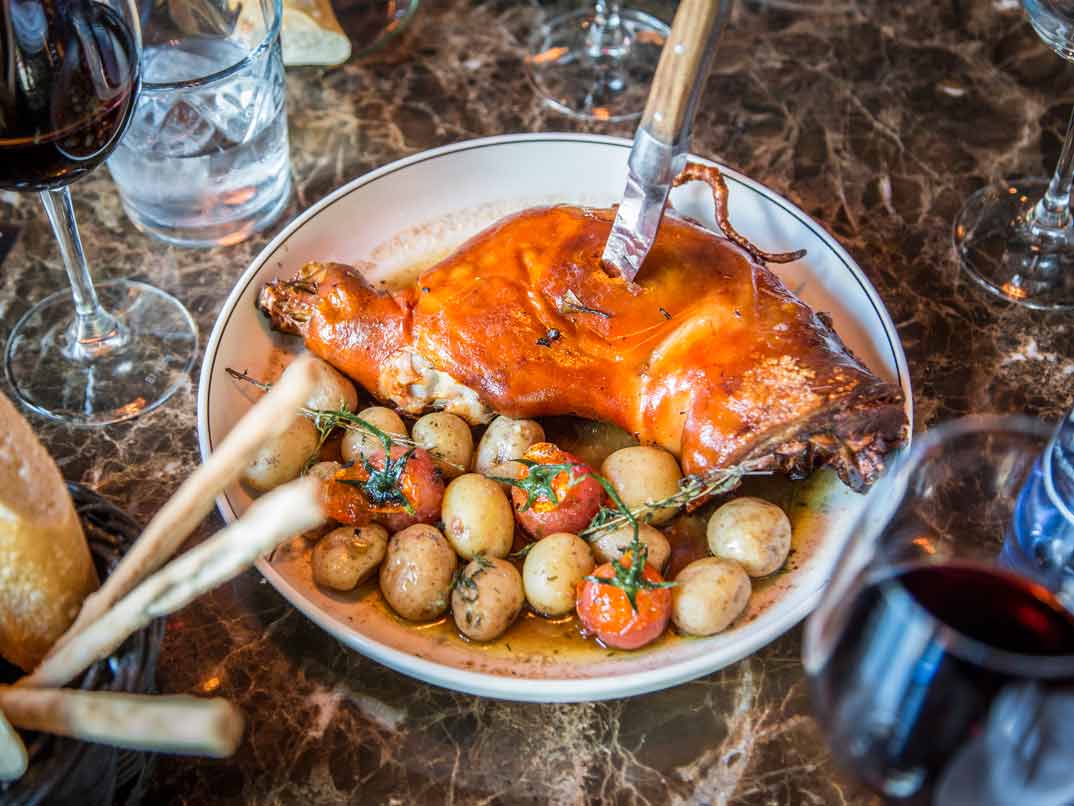 Para terminar una comida de 10, no podíamos irnos sin probar el «Pollo picantón braseado con miel y romero… ¡a lo Mingo!» y, el «Cochinillo asado«. Dos platos muy castizos.