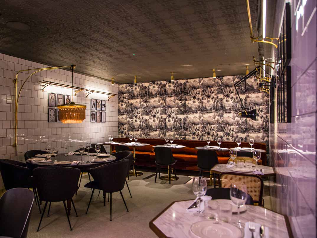 Desde la barra se accede al comedor principal, un amplio espacio donde los grandes espejos, los muebles de madera y el color terrazo le dan una apariencia realmente acogedora. En la primera planta, a la que se accede subiendo por unas históricas escaleras, es posible disfrutar de la misma oferta culinaria que en el comedor principal y donde espera su codiciado fotomatón con el que inmortalizar los mejores recuerdos. Esta zona del restaurante, con un ambiente aún más acogedor, se divide en dos espacios: una sala de paredes y techos azules con vistas a la glorieta de Bilbao, y otra más íntima en la que se combinan materiales como el azulejo, papel pintado y cortinas de terciopelo.