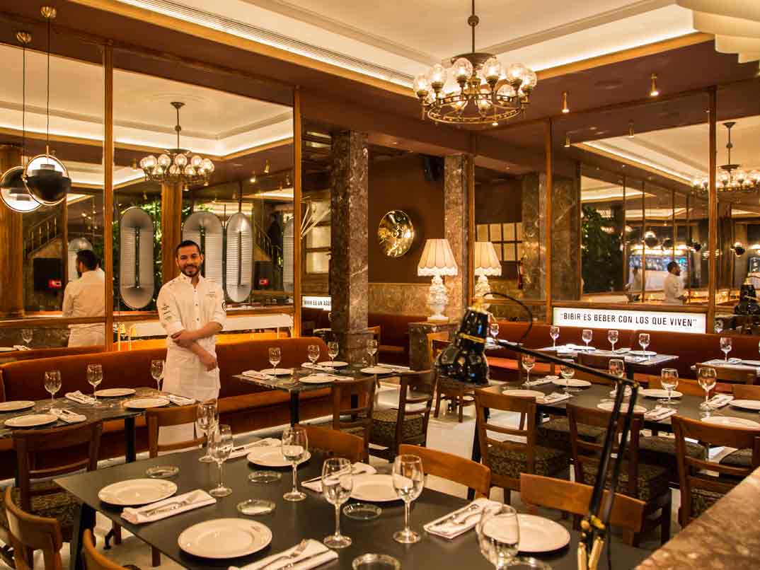 Desde que cruzas la puerta giratoria parece que viajas atrás en el tiempo, cuando los ilustres clientes pasaban las horas en sus sillones tapizados mientras escribían y contemplaban, a través de sus amplios ventanales, la rabiosa energía que inunda Madrid. Hoy en día, gracias al grupo El Escondite, los nuevos propietarios y, a la restauración realizada por el interiorista Juan Luis Medina del estudio Madrid in Love en marzo de 2017, se sigue respirando ese espíritu, impregnado en las maderas y mármoles. También en los grandes espejos del comedor o en el diseño de los toldos antiguos que comparten con el quiosco de la entrada, compañero de calle desde sus comienzos.