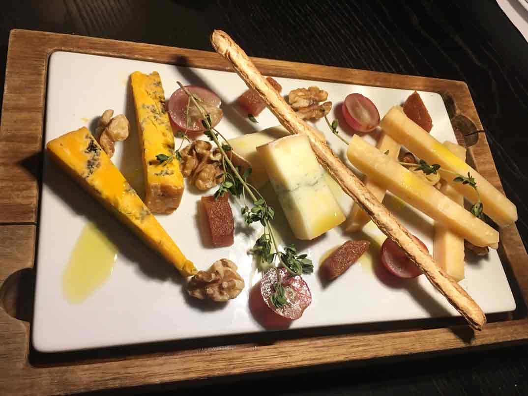 Comenzamos nuestra experiencia gastronómica con una «Tortilla trufada con huevos de corral «sin vuelta» con rúcula y piparras» y «Tabla de quesos artesanos, una selección internacional«.