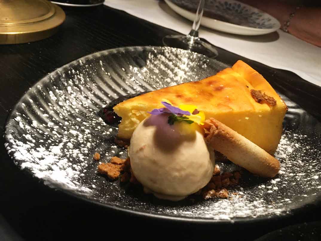 Y, como a nadie le amarga un dulce, qué mejor forma de acabar una gran comida que con una «Torrija caramelizada sobre arroz con leche y helado de violeta» y una «Tarta de queso con frutos rojos y helado de galleta artesana«… Un verdadero espectáculo.