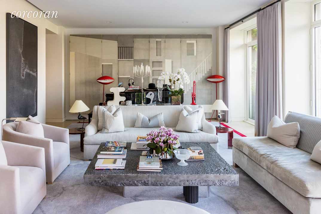 El ático que se encuentra en la planta 16 y 17 del edificio, tiene 500 metros cuadrados distribuidos en dos plantas, contando con cuatro dormitorios, cinco baños, un spa y unas espectaculares vistas a Central Park. A la vivienda se accede directamente desde el vestíbulo donde nos encontramos con una espectacular escalera metálica que conecta con la planta superior. El interior de la vivienda ha sido diseñado por el estudio de arquitectura Lee F. Mindel, of Shelton, Mindel & Associates.