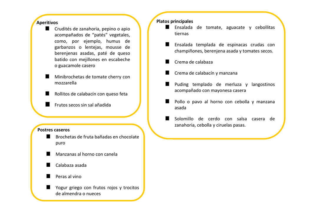 Si eres anfitrión, elige preparaciones saludables que ayudan a que las digestiones no sean muy pesadas, como las cocciones al vapor, con horno e incluso microondas. Para el aperitivo, opta por frutos secos tostados y patés vegetales en vez de aperitivos muy procesados con alto contenido en sal, azúcares añadidos y grasas de mala calidad y, en las guarniciones, desplaza los procesados y apuesta por las verduras, hortalizas o ensaladas con aceites de oliva, vinagre, hierbas o especies; o incluso productos con mínimo procesamiento como encurtidos u olivas. También puedes elegir como primer plato, platos calientes a base de verduras, por ejemplo, cremas de verduras, que dan una mayor sensación de saciedad y, para terminar la comida, echa mano de recetas con fruta, yogur, queso batido… “ingredientes que nos ayudan a elaborar postres saludables sin necesidad de recurrir constantemente a dulces y llenos de azúcar”, apunta Planells.
