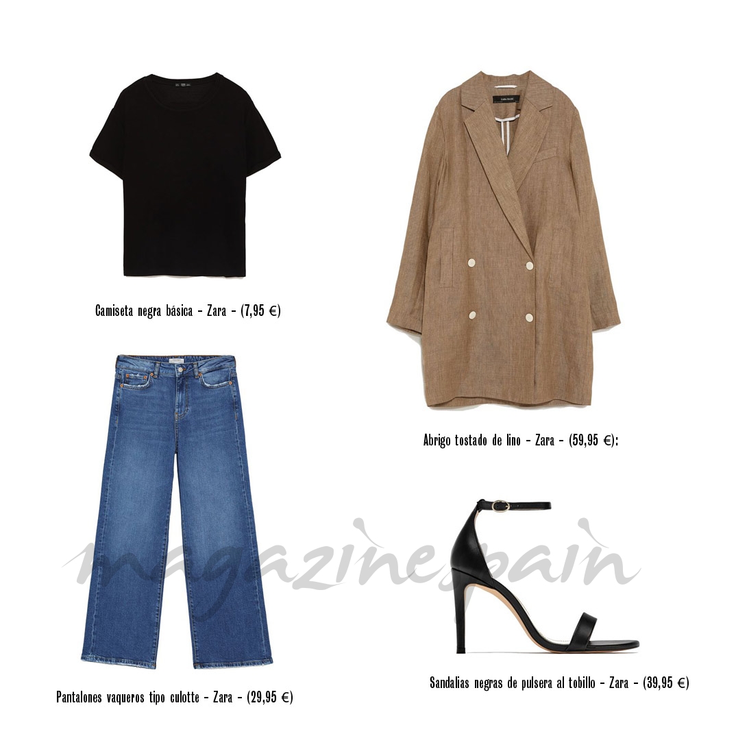 Para la ocasión, Marta Ortega eligió unos comodísimos vaqueros tipo culotte, con el bajo ancho cortado que dejaba ver los tobillos de Marta, que combinó con una básica camiseta negra, semitransparente y una gabardina en color caramelo de hechuras relajadas de lino.