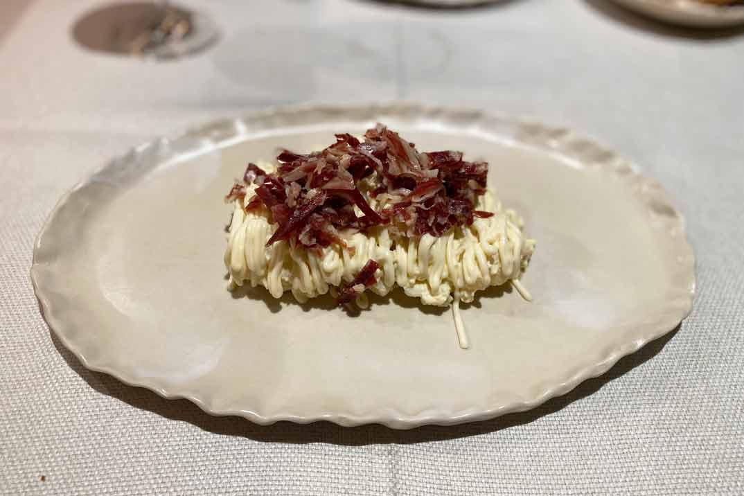 Como entrantes nosotros disfrutamos de la «Ensaladilla rusa con tacos de jamón ibérico de bellota» y el «Salpicón de mariscos Trabaguches» con gamba blanca, langostino y mejillón.