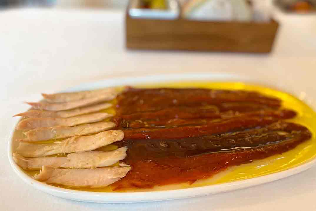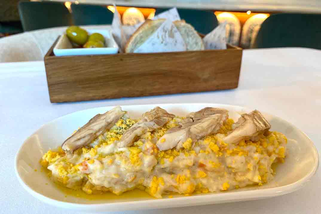 Los mejores entrantes son la «Ensaladilla rusa con lubina en aceite» y «Ensalada de pimientos de cristal asados con ventresca de bonito de costera«.