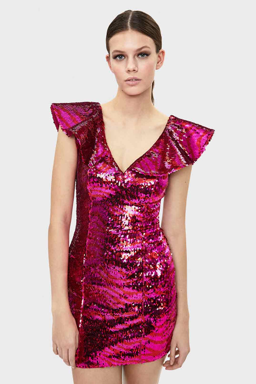 Los colores vívidos también son tendencia este año, como este vestido corto de lentejuelas azul eléctrico y esta pieza rosa fucsia con lentejuelas y volantes en la parte superior.
