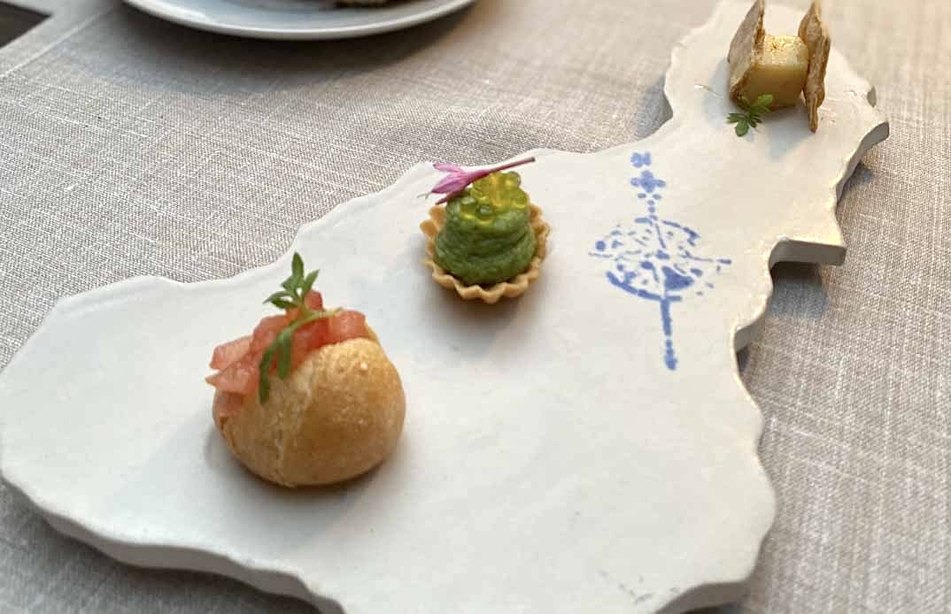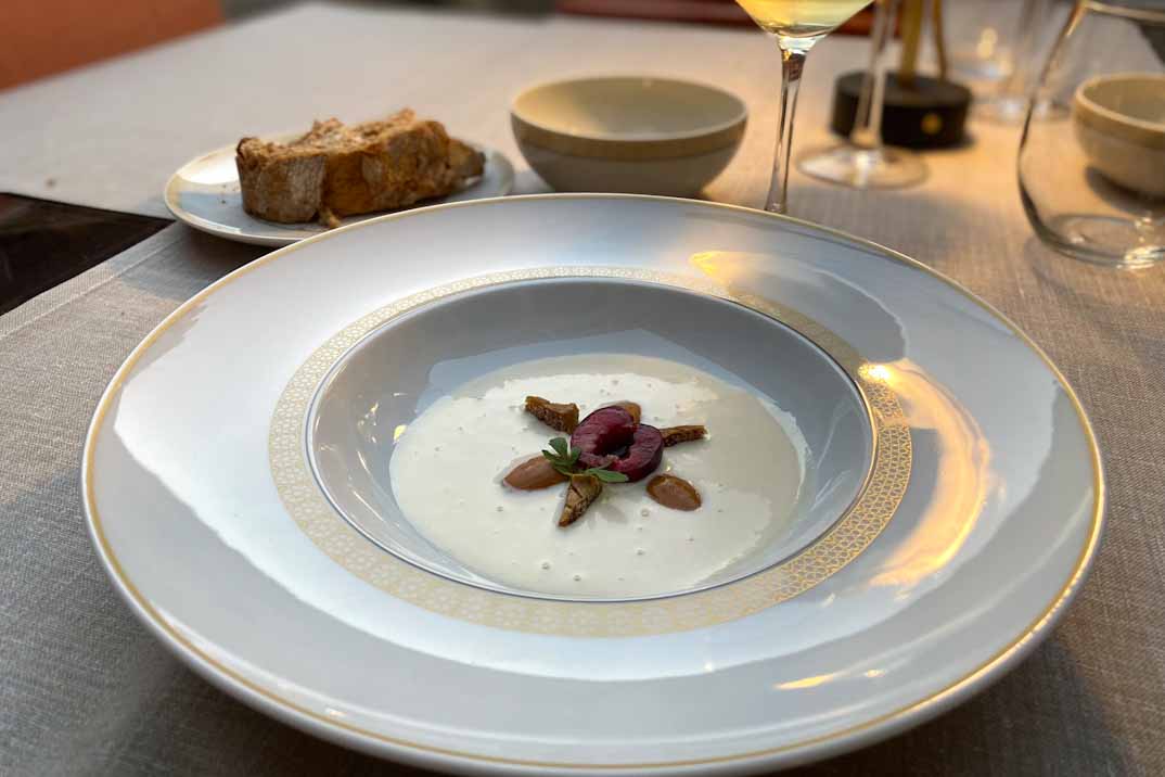 La propuesta estival de El Claustro se nutre de productos de cercanía y recetas reinterpretadas con técnica y creatividad, ofreciendo una experiencia que conjuga tradición y modernidad. Nuestra cena comenzó con un aperitivo exquisito: un bocatín de tomate de Amela, una tartaleta de hummus de albahaca y queso curado en aceite de Montefrío, que nos introdujeron a la riqueza de sabores locales. De entrante, disfrutamos del ajo blanco con higos de temporada y almendras estofadas de la Contraviesa, una combinación fresca y delicada que marcó el tono de la velada.