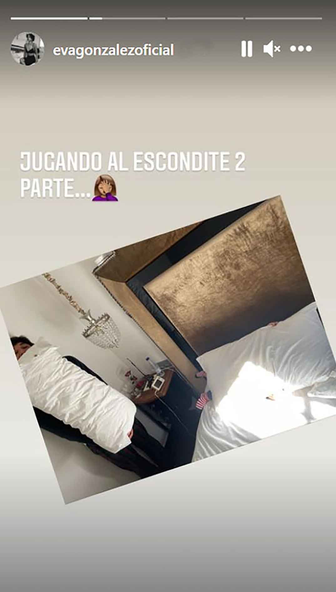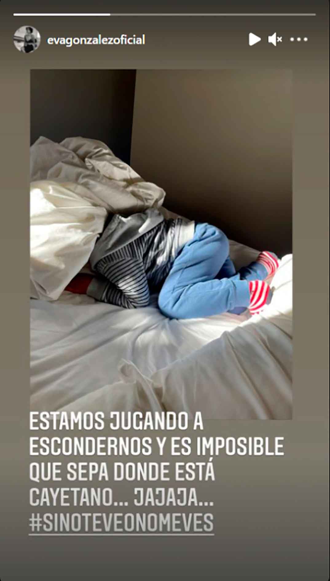 Así lo ha mostrado ella misma junto a una imagen en la que Cayetano aparece tumbado en la cama, donde únicamente se tapa la cabeza con el nórdico, dejando a la vista el resto del cuerpo. «Estamos jugando a escondernos y es imposible que sepa dónde está Cayetano», ha dicho con gran sentido del humor, revelando además cuál es la ‘norma’ de su hijo: «Si no te veo, no me ves«. Después, Eva compartía otra divertida foto correspondiente a la ‘2ª parte’ del juego con su hijo, en la que vemos esta vez al padre de espaldas a la pared intentando ‘esconderse’ detrás de una almohada.
