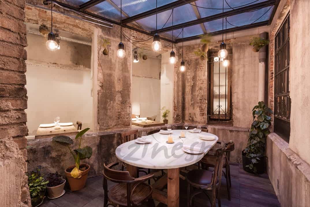 Tiene dos salas principales, un coqueto patio interior a modo se semi privado y dos mesas centrales como para 16 personas donde se comparte el sitio al estilo neoyorkino. De la estética del local se ha ocupado Arquitectura Invisible, el estudio de Ignacio Redruello (hermano de Nino y autor de La Gabinoteca y Cachivache Taberna)… Muros de ladrillo, suelos de acero y techos altos: 400 metros de local urbanita y austero al mejor estilo Manhattan.