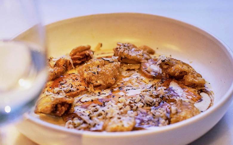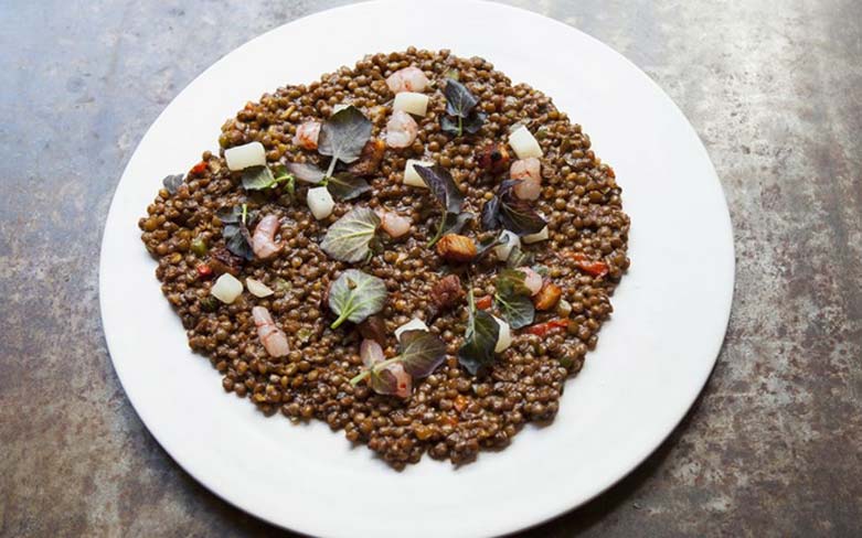 Siguiendo su fórmula ligada a compartir platos escogemos: “Lentejas salteadas, gamba roja y panceta.”, «alitas de pollo deshuesadas, crema de puerro, boniato asado y yema de huevo» y su espectacular «erizo del Cantábrico».