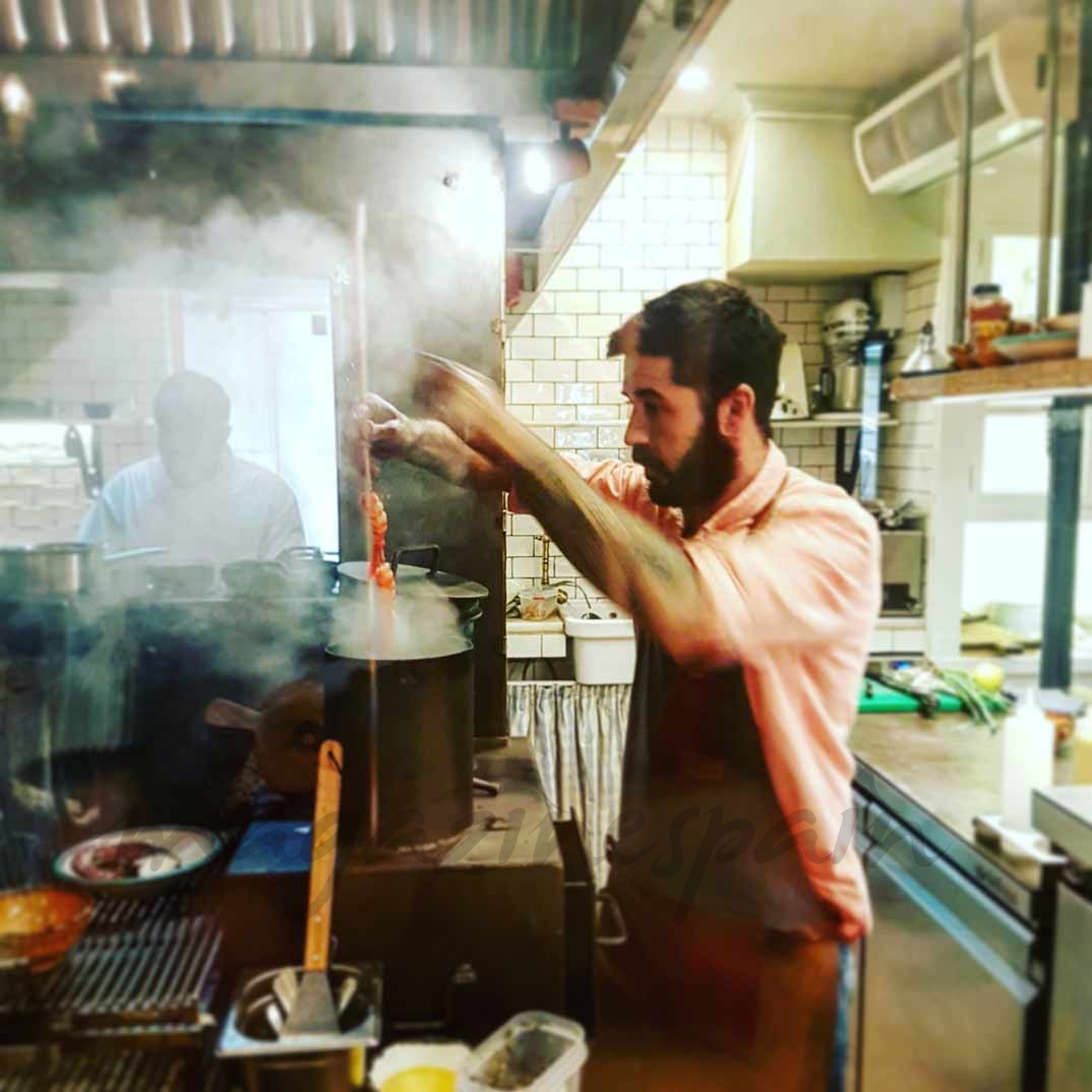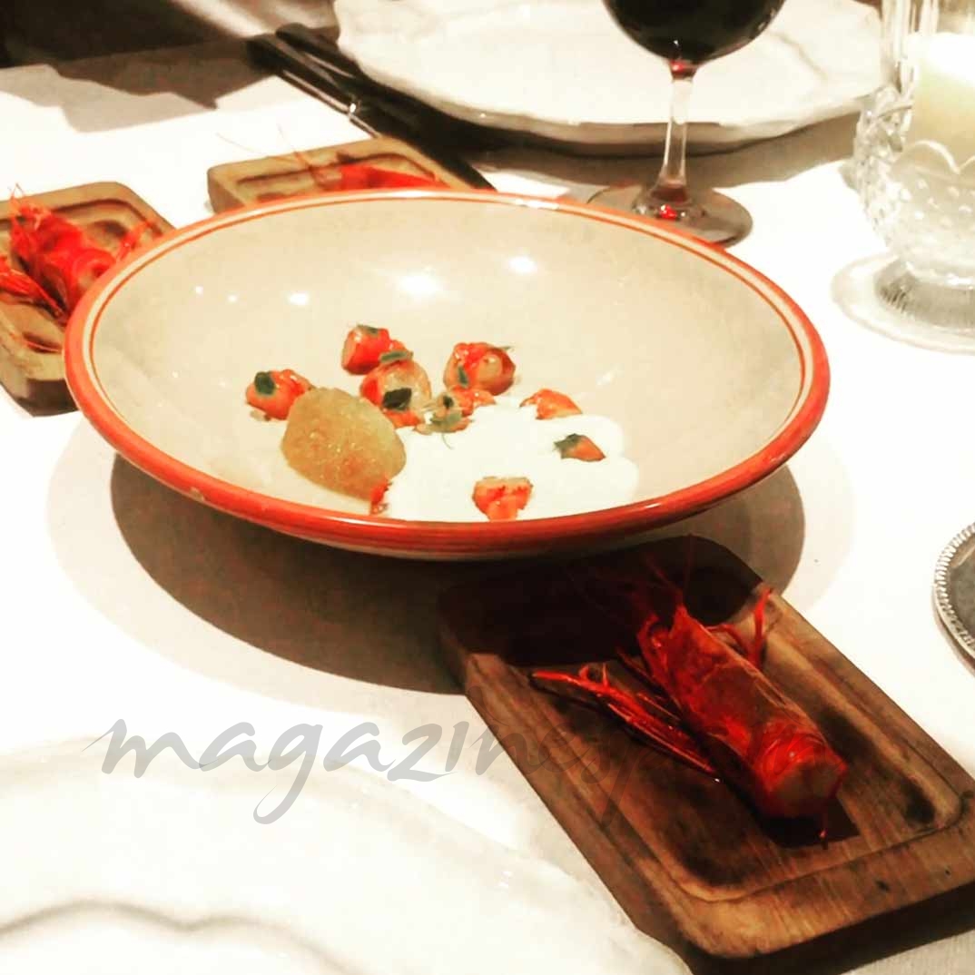 Hay formas y “formas” de cocinar un carabinero. En Fuego, Gonzalo te sorprende con el “plato del pescador”, en el que ahuma en caliente el carabinero y lo acompaña con su cabeza a la brasa (para chuparla y chuparse los dedos), granizado de amontillado, ajoblanco y anisados… Una combinación de sabores que se compenetran a las mil maravillas y le dan un toque diferente al carabinero.