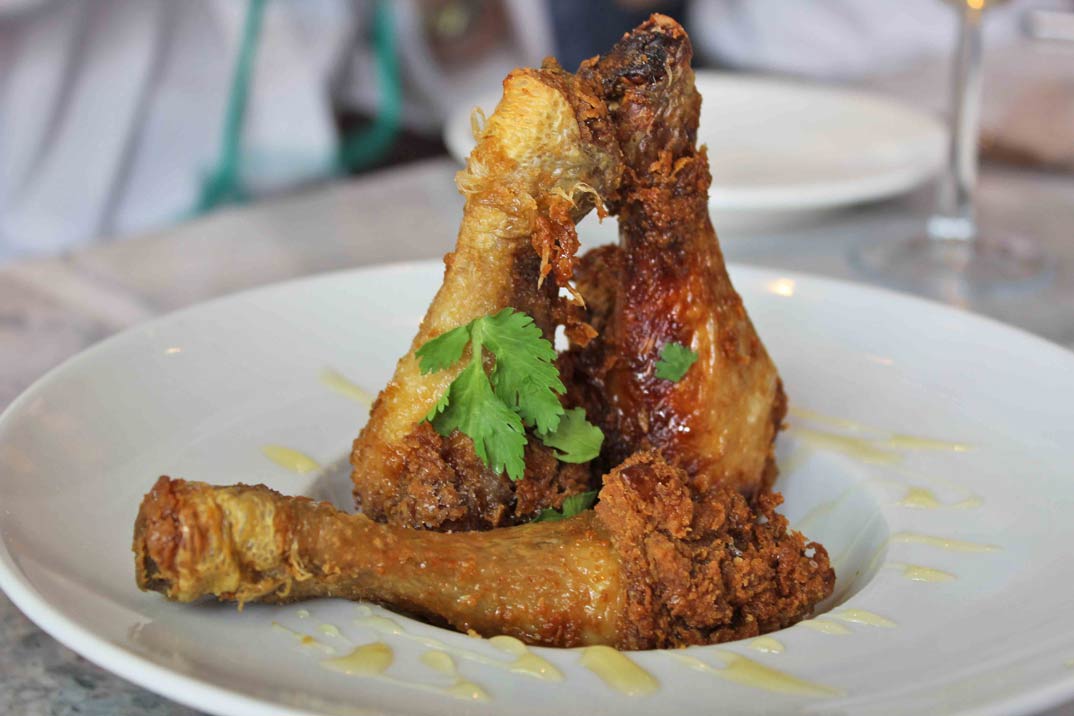 Para los carnívoros, dos buenas recomendaciones: el «pollo filipino» frito con uvas, kimchi y miel y, el «Steak tartar«, un solomillo picado a cuchillo de «La Finca» con helado de nostaza y pan sardo.
