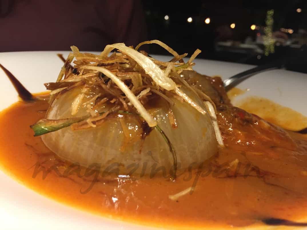 La apuesta principal de La Máquina pasa por los pescados, así que compartimos la “Trancha de rodaballo a la plancha” y unas “Cebollas dulces rellenas de bonito del norte”.