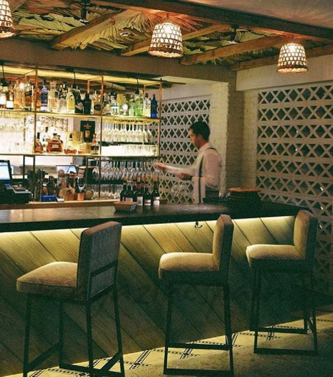 No es tarea fácil escoger el rincón donde disfrutar de la velada. Según atravesamos la entrada, una parra nos invita a disfrutar de una agradable terraza con una hoguera en el centro. La zona principal está presidida por una barra, alrededor de la cual se van formando diferentes espacios diferenciados a través de los suelos hechos con materiales como granito, barro o hidráulicos.