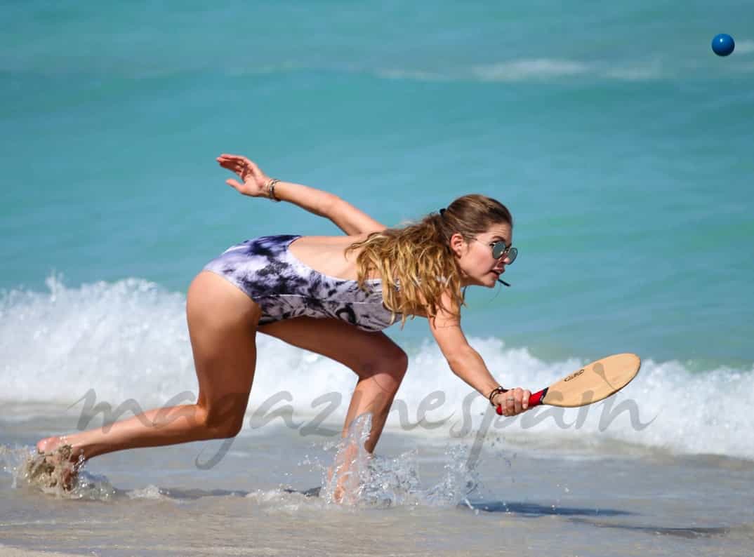 Presumiendo de sus impresionantes curvas a la orilla del mar en Miami la hemos sorprendido mientras jugaba a las palas con su marido .