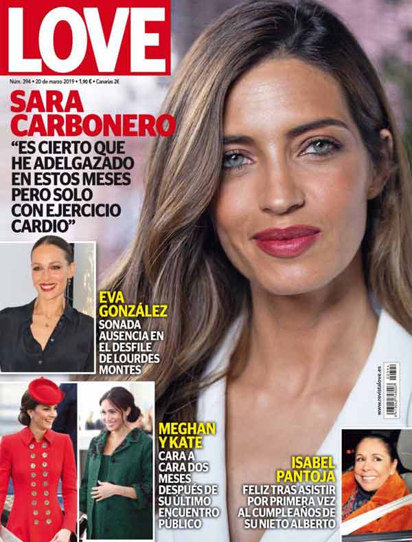 Sara Carbonero es la protagonista de la revista «Love«. La presentadora, que tras su reciente reincorporación a la tele, vive a caballo entre España y Oporto, confiesa: «Es cierto que he adelgazado en esos meses pero solo con ejercicio cardio». Meghan Markle y Kate Middleton, se ven las caras dos meses después de su último encuentro público, en el Día de la Commonweath como el 50 aniversario de la investidura del príncipe de Gales. Eva González, la gran ausente en el desfile de su cuñada, Lourdes Montes en la pasarela D’Flamenca Doñana 2019. E Isabel Pantoja, feliz tras asistir por primera vez al cumpleaños de su nieto Alberto.