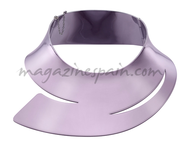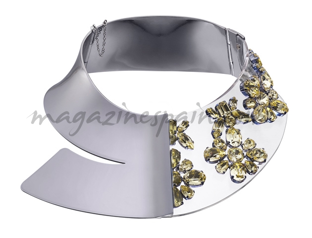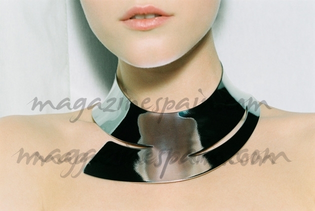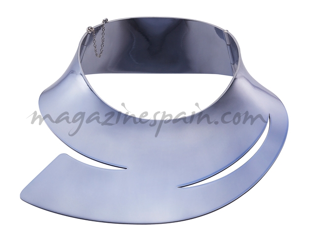 Una gargantilla babero, estilo space age es la encargada de abrir la caja de los recuerdos de 1960. haciendo reminiscencia al modernismo sin remordimientos del que fue el conductor de la década. Dior in me fue el accesorio estrella de Raf Simons en su primer desfile de ready to wear para la casa Dior.