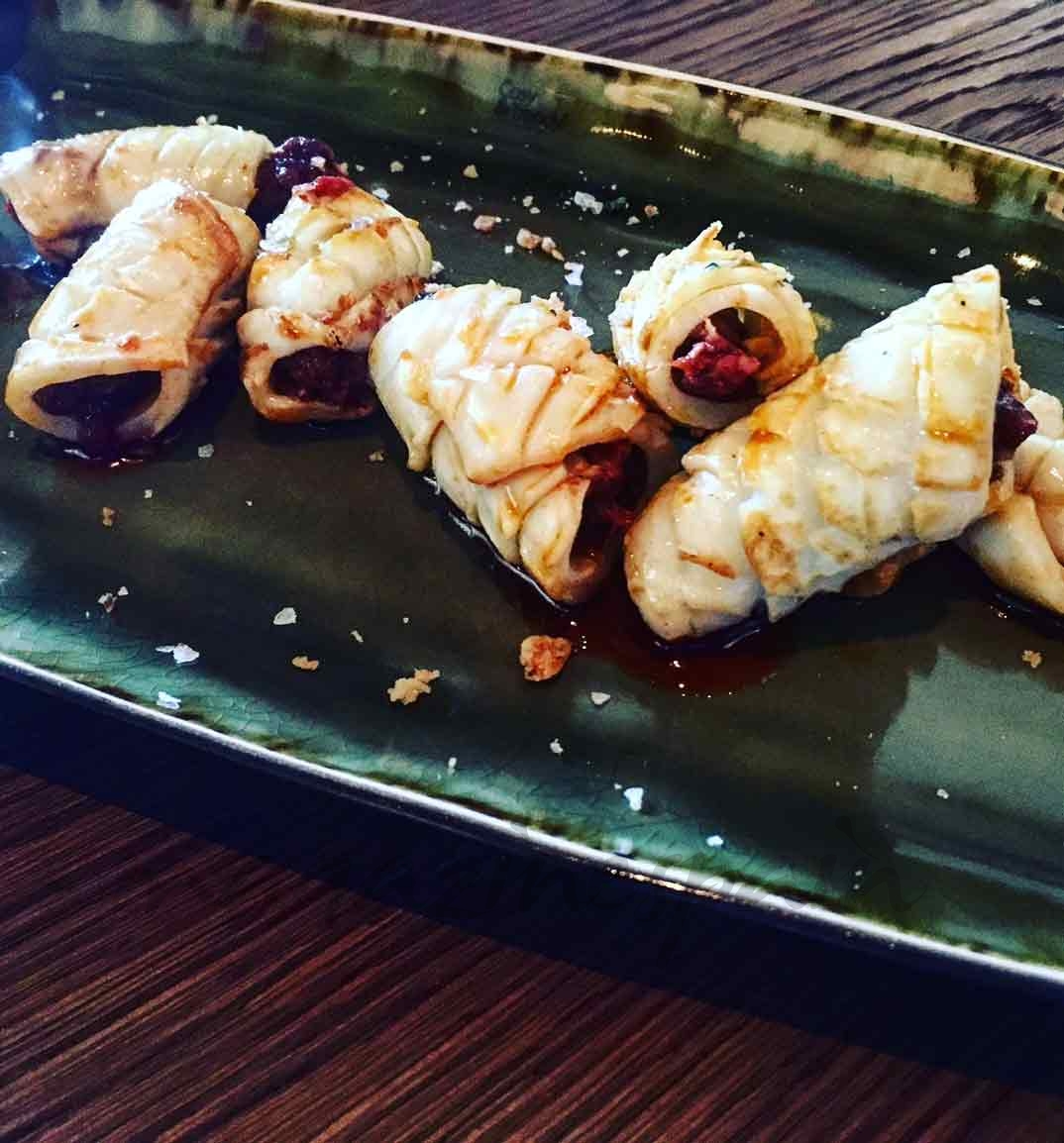 Mientras esperamos a que llegue el arroz, vamos abriendo boca con unos “buñuelos de bacalao” y un “calamar de playa relleno” de sobrasada, un plato de lo más original.