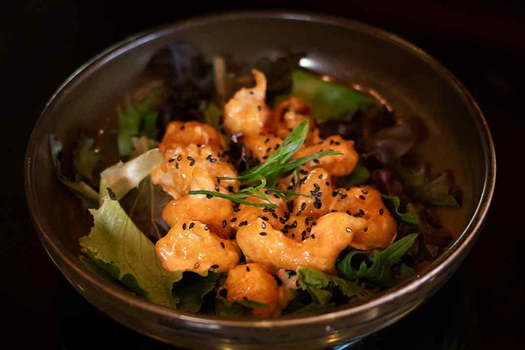 De sus Influencias japo-ibéricas, muy recomendables las «Brochetas Yakitori de pollo de corral ahumado y cebolleta japonesa» y los «Langostinos tigre en salsa kewpie con kimuchi».