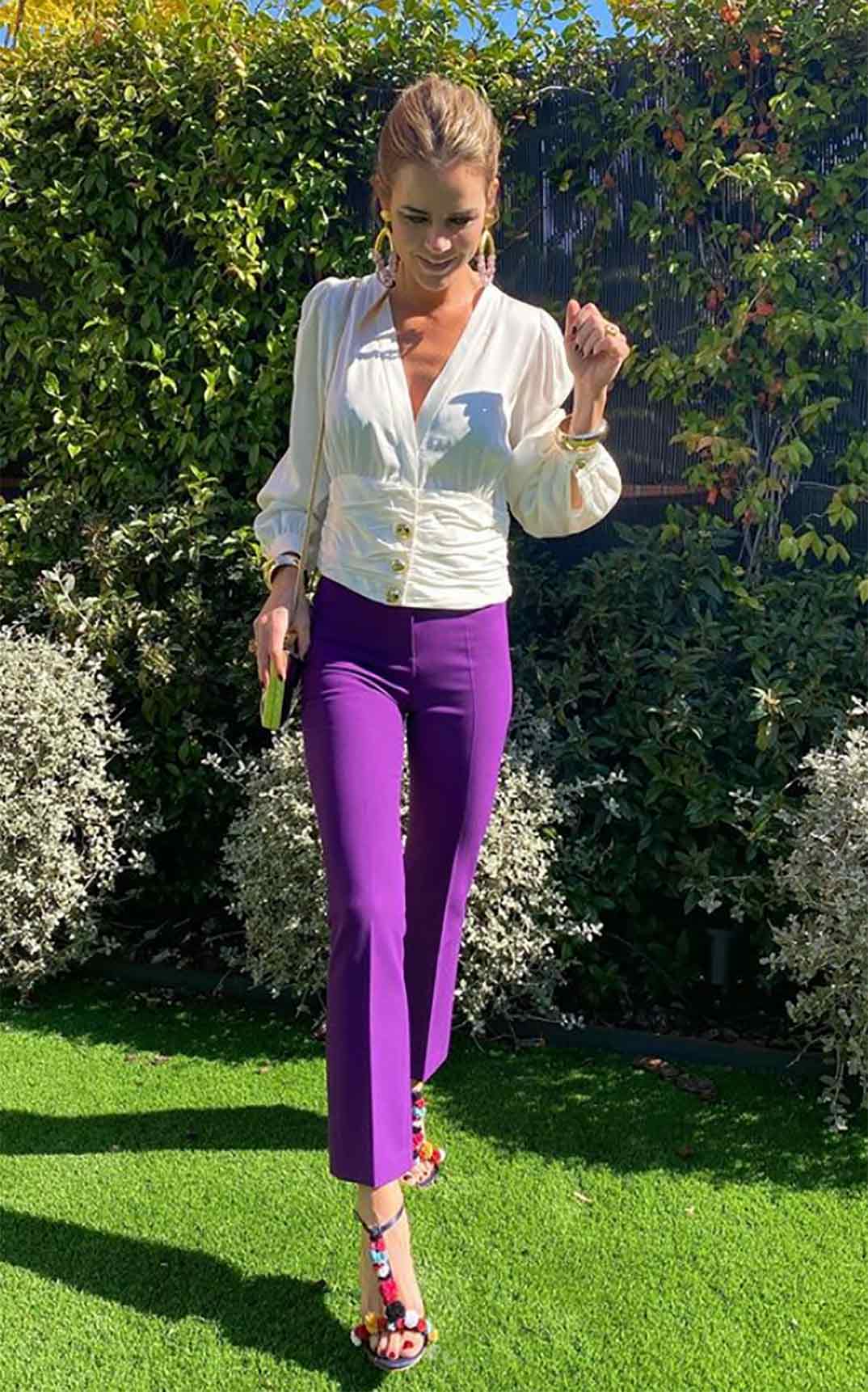 También, gracias a sus redes sociales, hemos podido ser testigos del look ideal que ha elegido Amelia para la ocasión. Se trata de un elegante y colorido conjunto compuesto por una camisa blanca con escote en uve, mangas abullonadas, bajo fajín y tres grandes botones joya de inspiración vintage y un pantalón recto morado al tobillo. Completando su estilismo, unas sandalias negras de tacón con borlas de colores que ha combinado con un clutch dorado, unos pendientes maxi y pulseras a juego con piedras malvas.