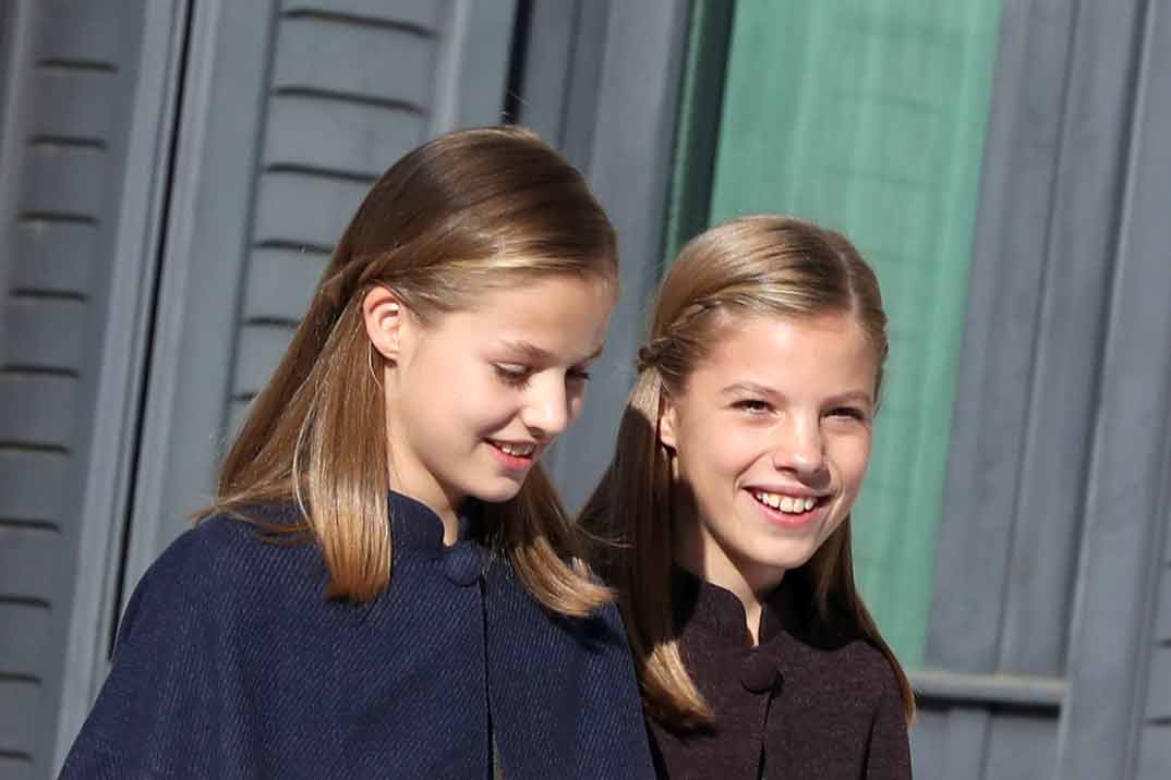 Sus hijas, la princesa Leonor y la infanta Sofía, han lucido looks muy similares, con dos vestidos de fondo gris con estampado de cuadros en rojo y azul, que han combinado con una capa a juego, con medias cortas y bailarinas.