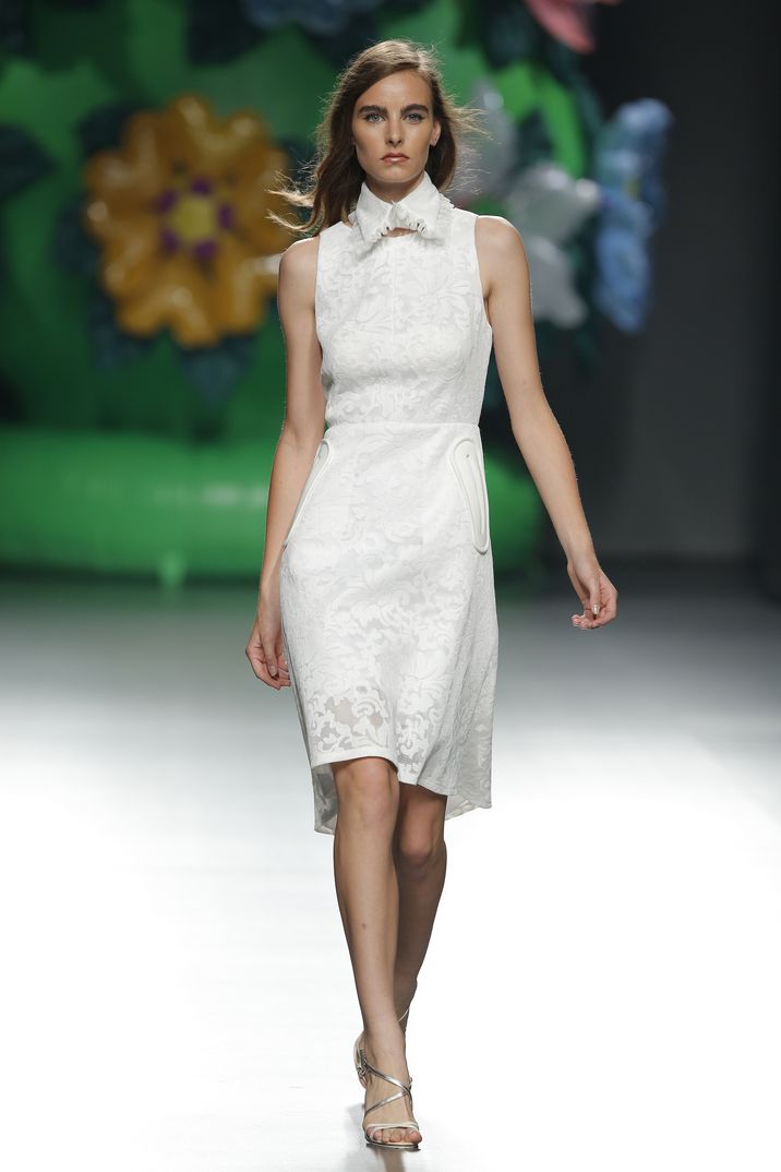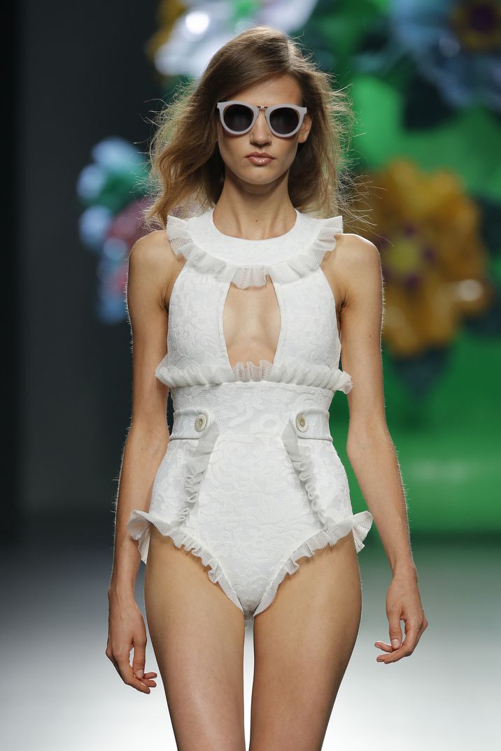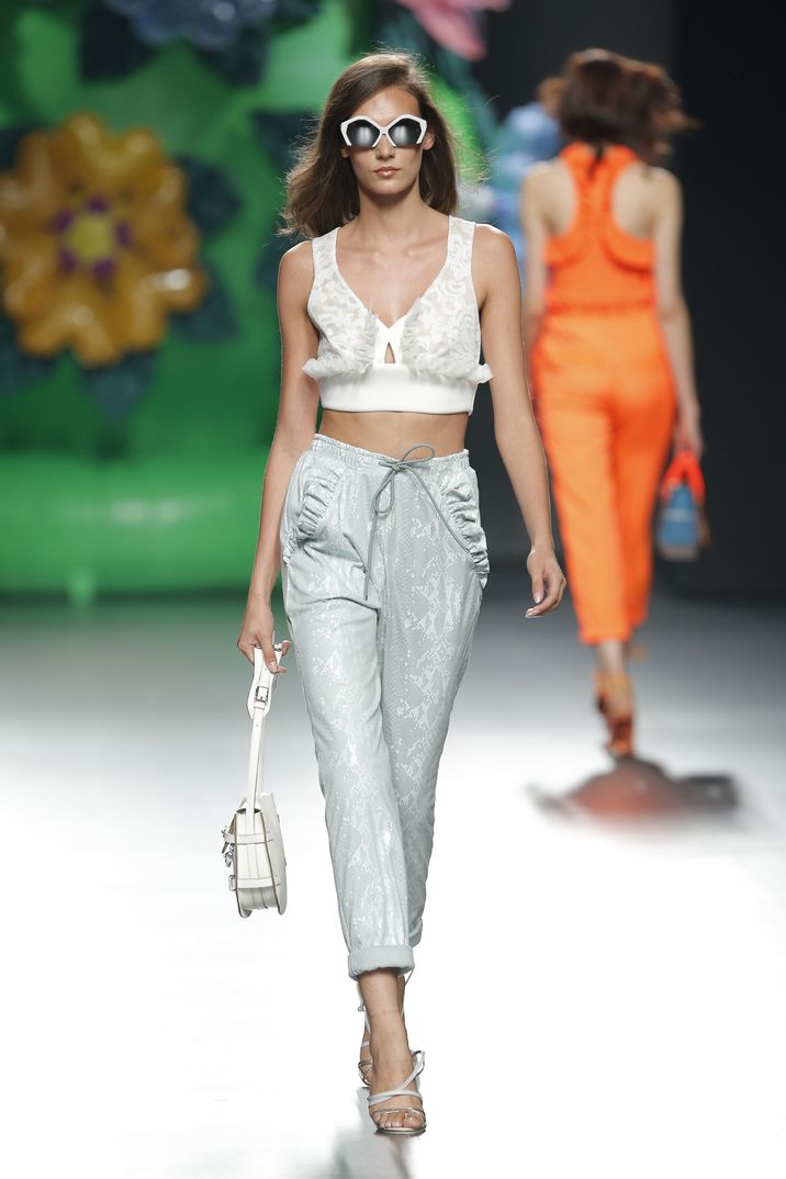 Faldas largas y minis, pantalones de tiro bajo (haren),chalecos en neopreno, crop-top, shorts, vestidos largos con plumas y lentejuelas, son algunas de las propuestas más significativas de la diseñadora toledana para la próxima Primavera-Verano 2016.
