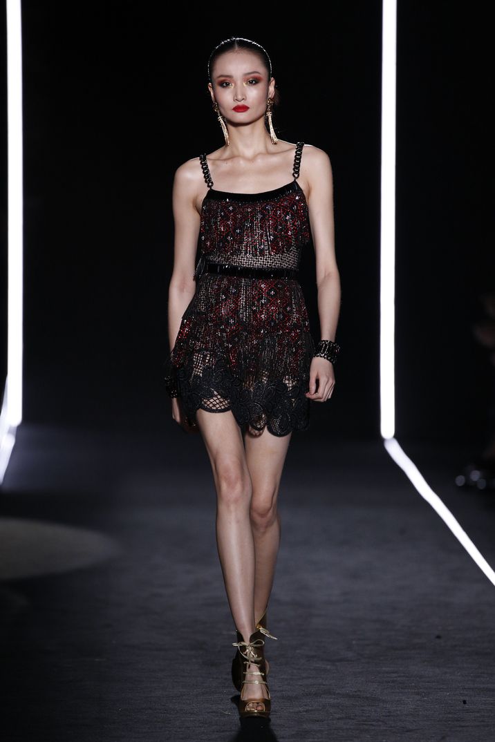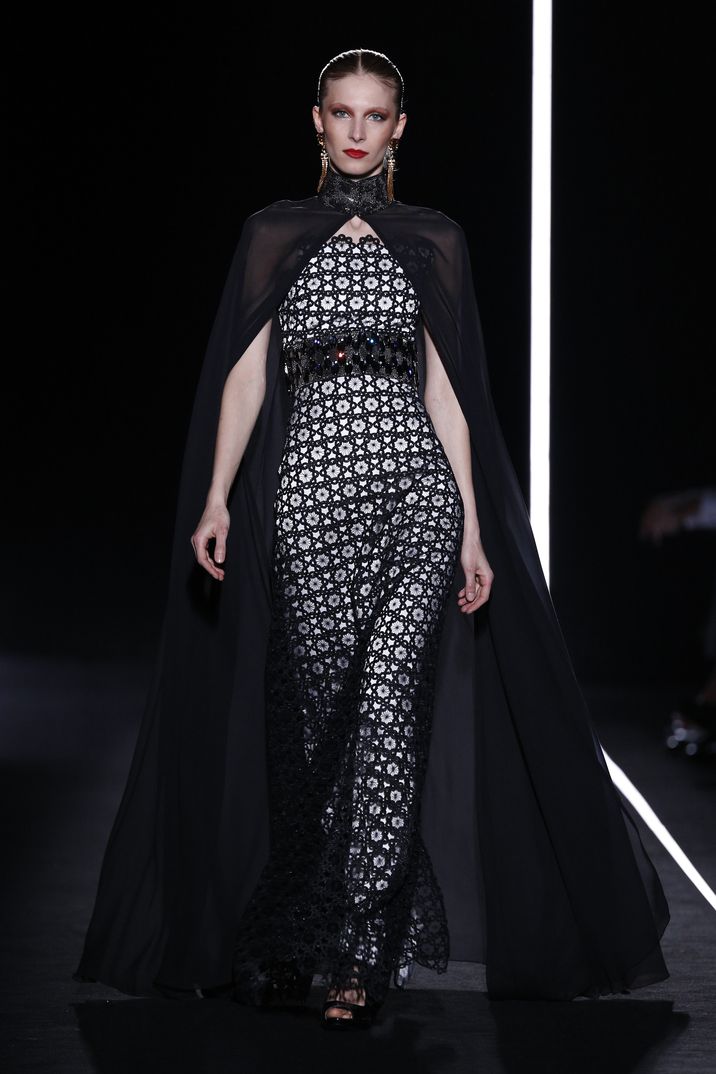 con un ambiente muy oscuro, humos rojos, negros, plata, para mostrar sedas, encajes, cristales de azabache, entre otros magníficos materiales.