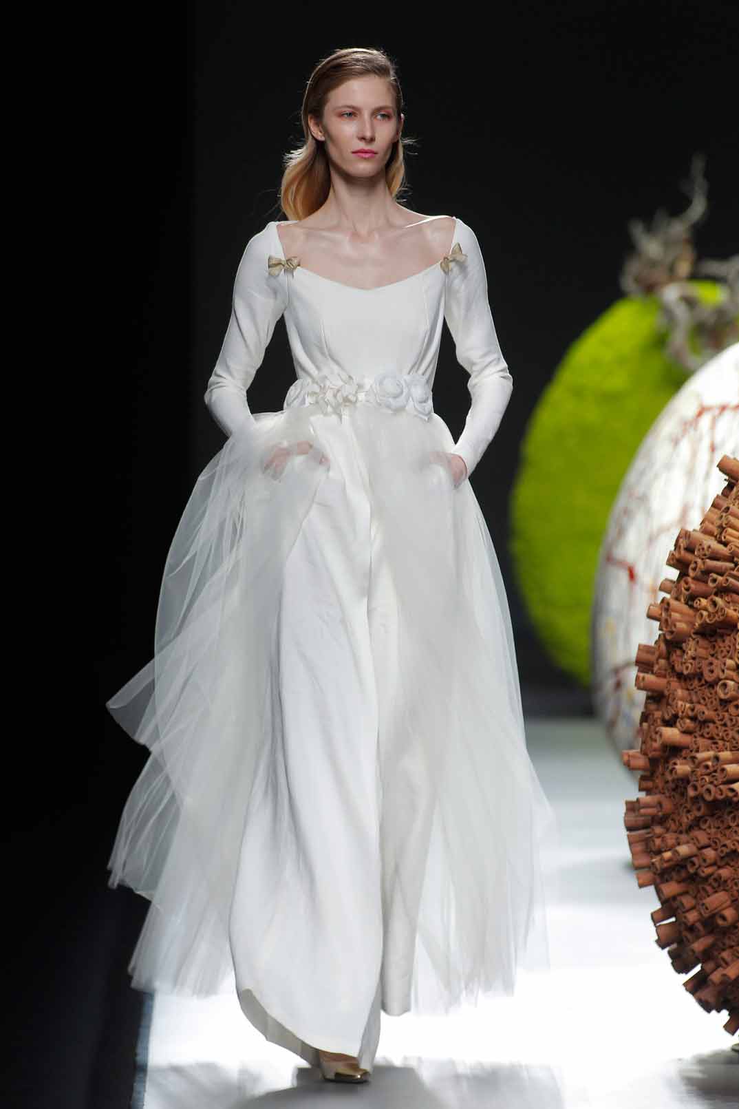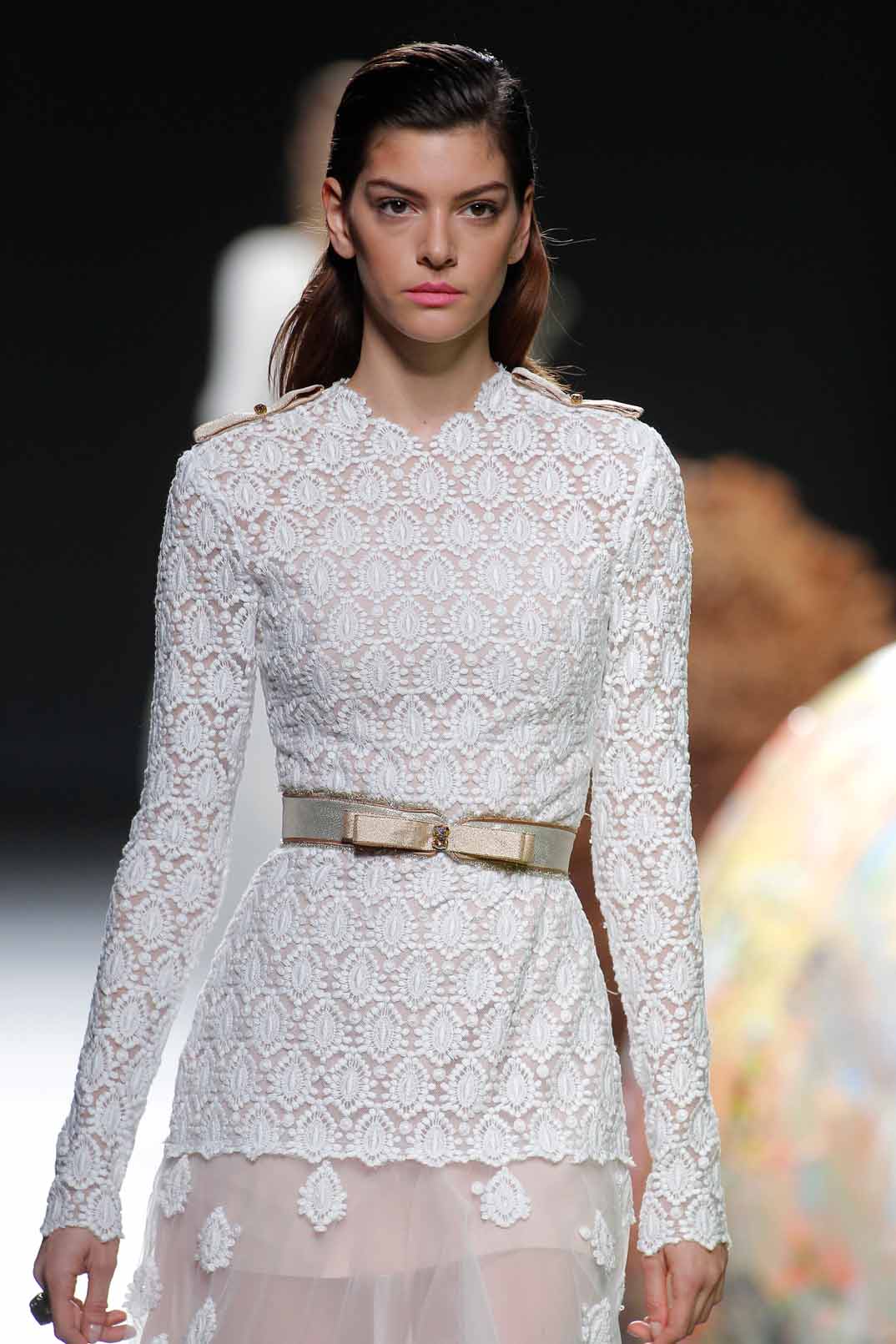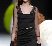 Tejidos caros, como la muselina, sedas, cashemere o crepé, en vestidos lady, faldas rectas, chalecos, faldas evasé y camisas con lazo. Por la noche, propone vestidos lisos en colores suaves y cierra el desfile con vestidos de novia.