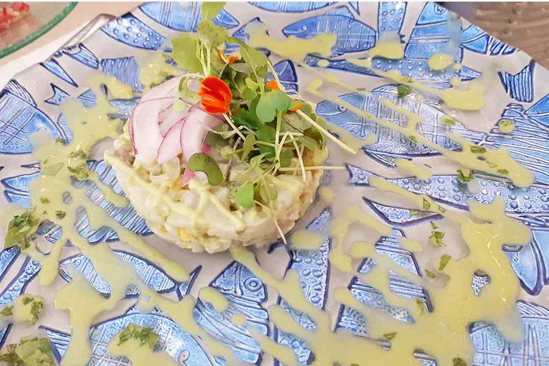Le siguen tres propuestas de pescados en crudo –salmón con ajo blanco y miso, lubina en ceviche y atún rojo en tartar– y un par de ensaladas con toque de mar: de sardina ahumada con rúcula parmesano y quinoa y de anchoa del Cantábrico con tomate de Benissa y queso servilleta.