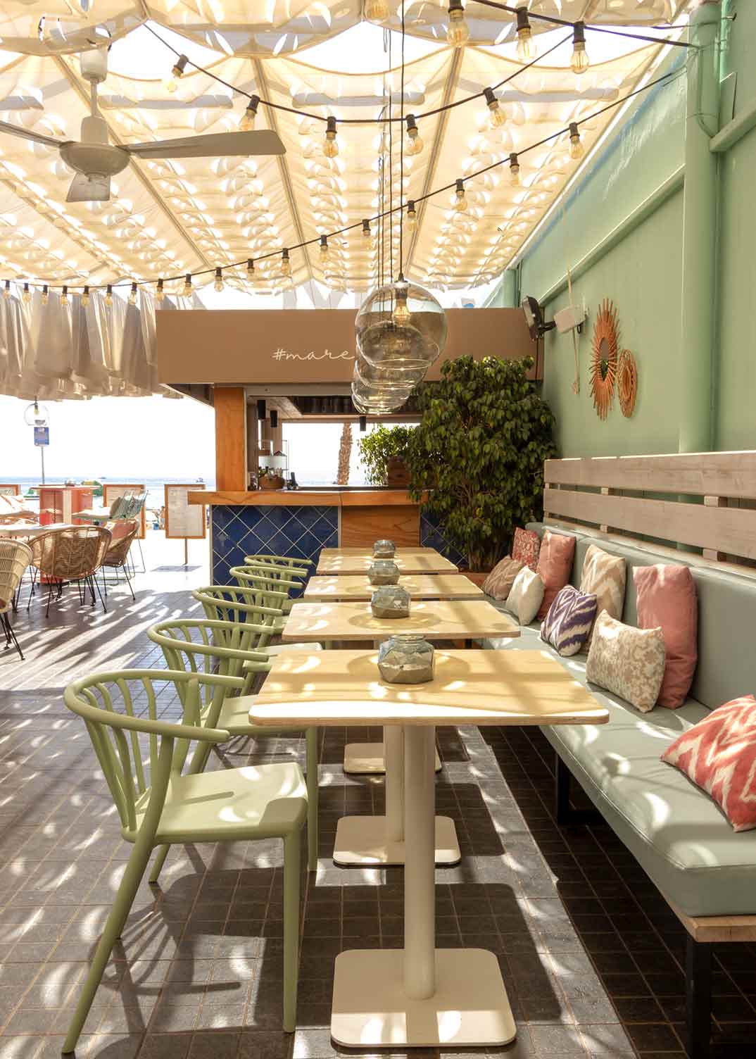 Al igual que la gastronomía de Mare es un homenaje al producto local, su terraza es un reflejo de la luz y el estilo mediterráneos. El local ha sido concebido como un espacio vibrante, que moldea los colores de la naturaleza para crear una atmósfera fresca y elegante a la vez. Los estampados ikat (geométricos) y la cestería artesana tradicional protagonizan la decoración, que utiliza una paleta de colores inspirada por los amaneceres de la costa.