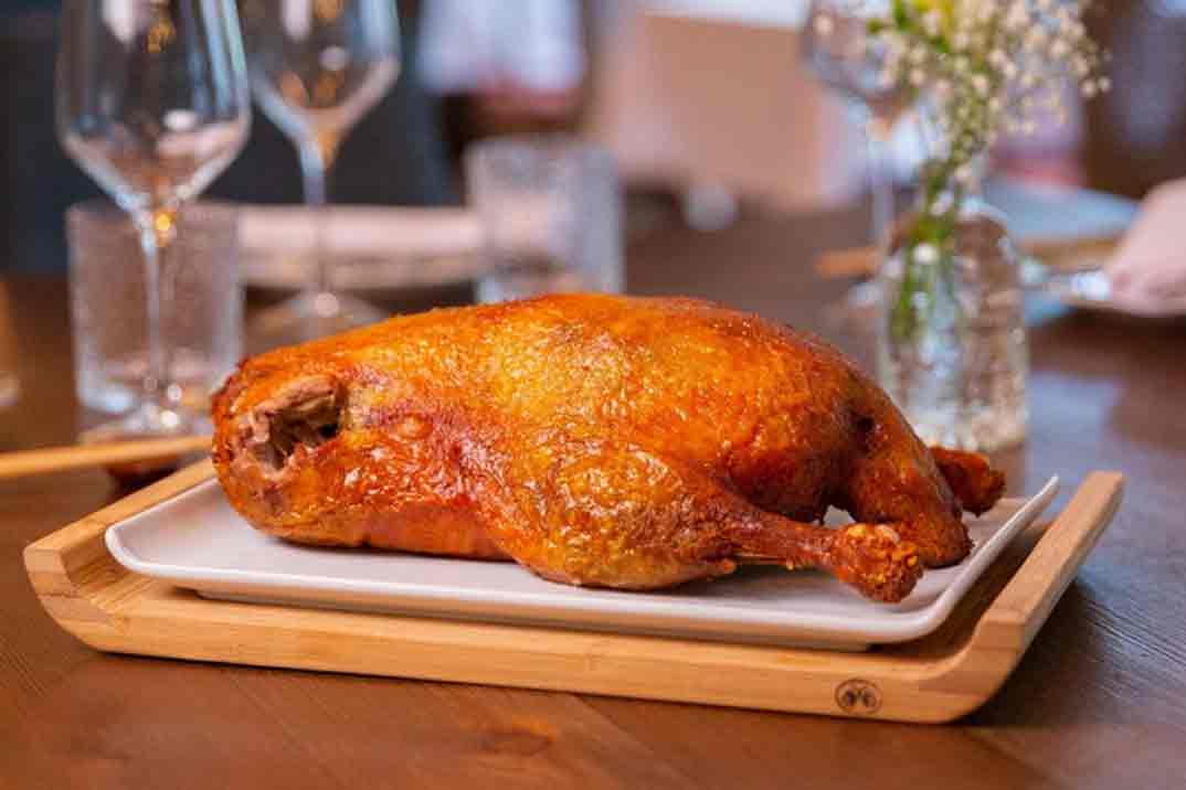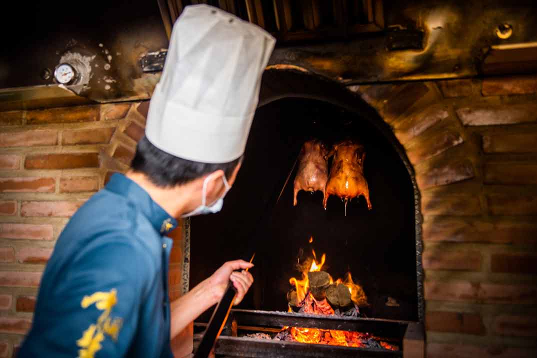 La leña también es importante y para ‘alimentarlo’ se ha elegido la de árboles frutales, sobre todo de manzano y cerezo, que le darán un aroma afrutado a la carne; y al frente de las llamas, un experto que sigue paso a paso la tradición para elaborar esta receta ancestral. Lo primero, una vez limpia el ave, es macerarla con sal, pimienta, 5 especias y jengibre durante 24 horas. Y a este reposado le siguen 18 pasos para que quede perfecto: escaldarlo, naparlo con miel, rellenarlo y luego darle la vuelta cada 20 minutos hasta que la piel adquiera ese característico color rojizo brillante.