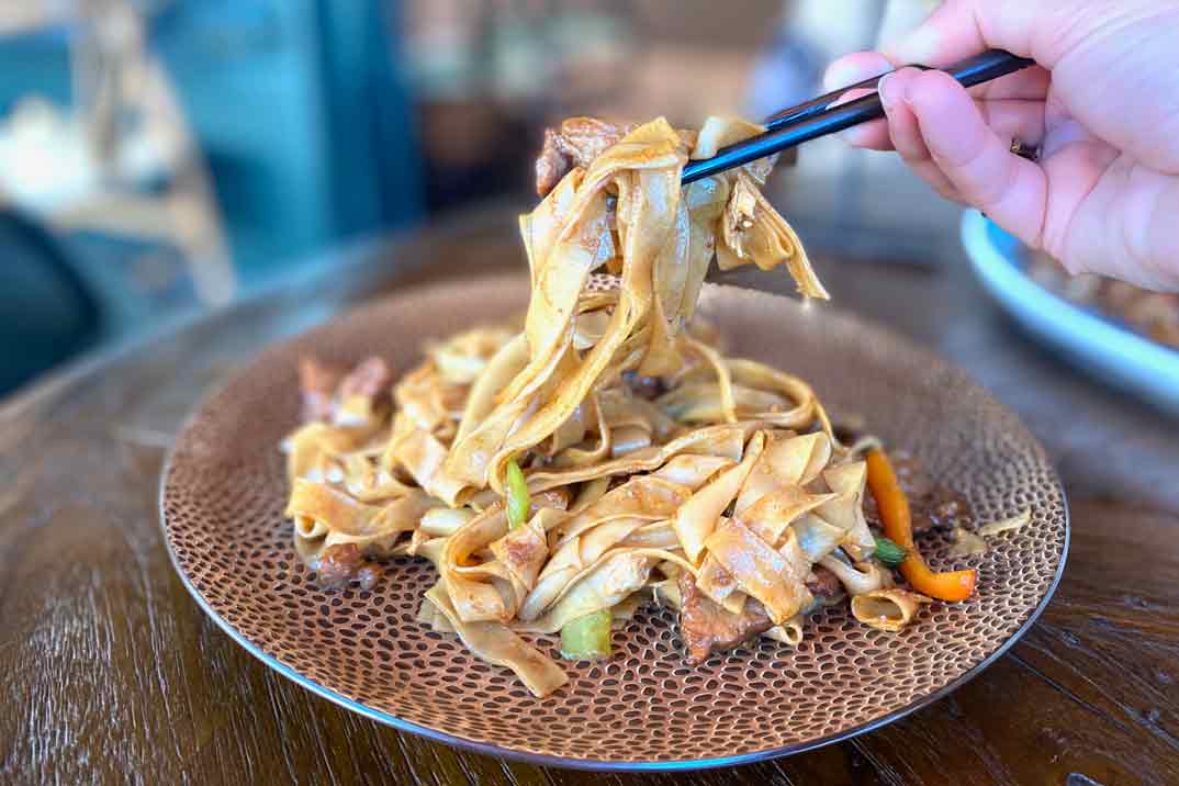 Muchos restaurantes usan el wok, pero pocos respetan la tradición de añadir los ingredientes justo cuando alcanza los 200 ºC, generando una espectacular llamarada de casi un metro de altura. Este proceso, esencial en la cocina tradicional china, aporta a los platos un sutil toque ahumado y tostado, característico de esta técnica milenaria. Y claro ejemplo de ello es su «Pasta plana de arroz» salteados con langostinos, salsa marinera china con shitake asados, huevo camperos guindillas y mejillones al vapor.