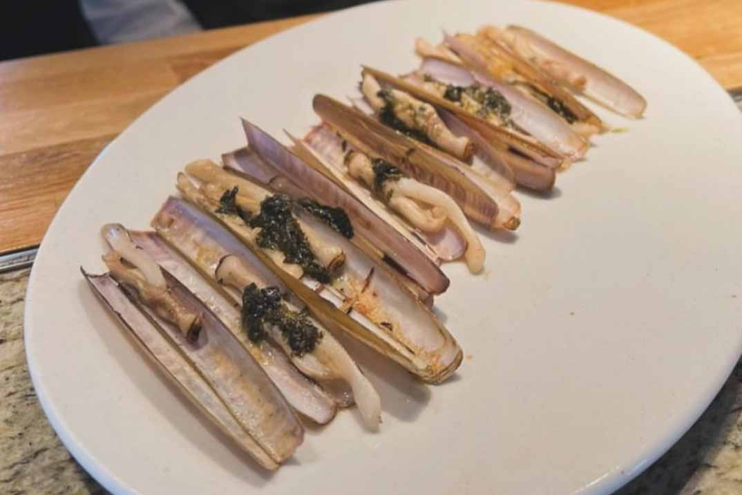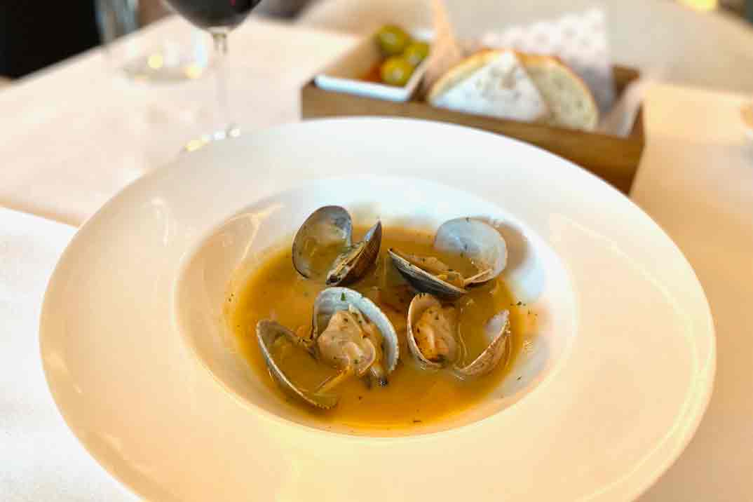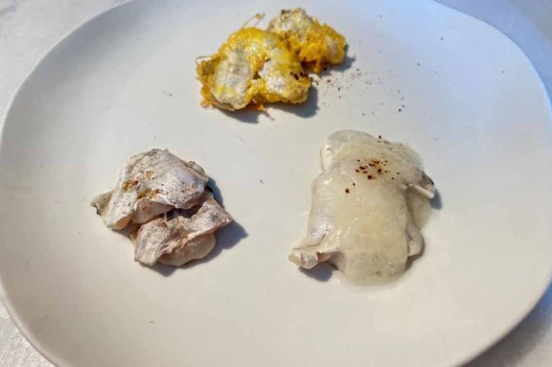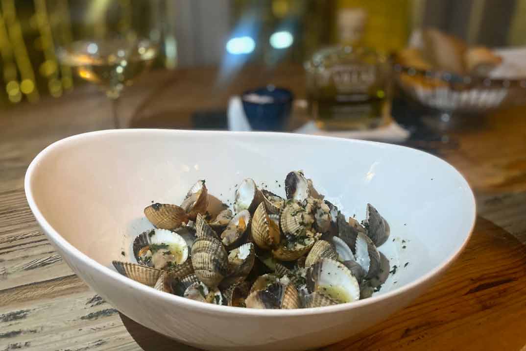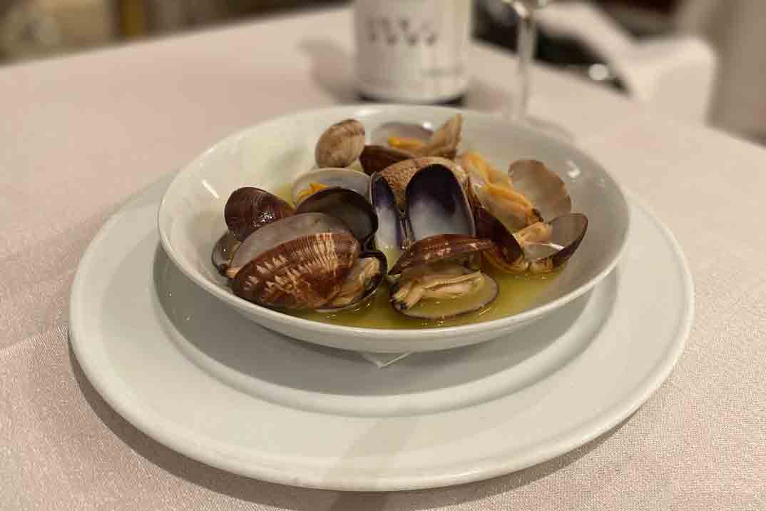 Comenzamos con una «Ensaladilla rusa con lubina en aceite» y «Ensalada de pimientos de cristal asados con ventresca de bonito de costera«. El marisco protagoniza parte de la carta con producto del mar como la «Zamburiña gallega a la plancha» y la «Almeja de Carril a la sartén»