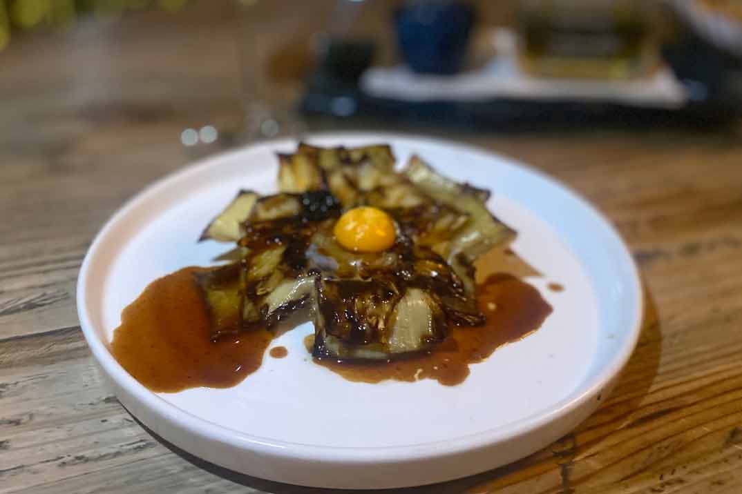 Continuamos nuestra experiencia en la sala principal de La Lonja con unos «Berberechos, salteados con ajo, guindilla y un delicado toque de champagne«, una «Alcachofa confitada, huevo de codorniz flambeado y caviar» y «Centolla con huevo poché«. Terminamos compartiendo «Bacalao skrei con parmentier de patata» y «Costilla de Black Angus a baja temperatura».