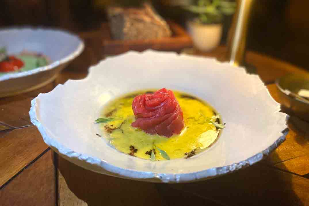 Un rincón mágico donde disfrutar de referencias imprescindibles del chef como su «Tomate Nitro con gazpacho verde«, indudable icono del que fue el buque insignia de Dani García que obtuvo tres Estrellas Michelin en 2018 o, de la sección dedicada al atún de Barbate, el «Descargamento de atún» con pimientos amarillos, lima y aceituna negra… Un verdadero manjar.