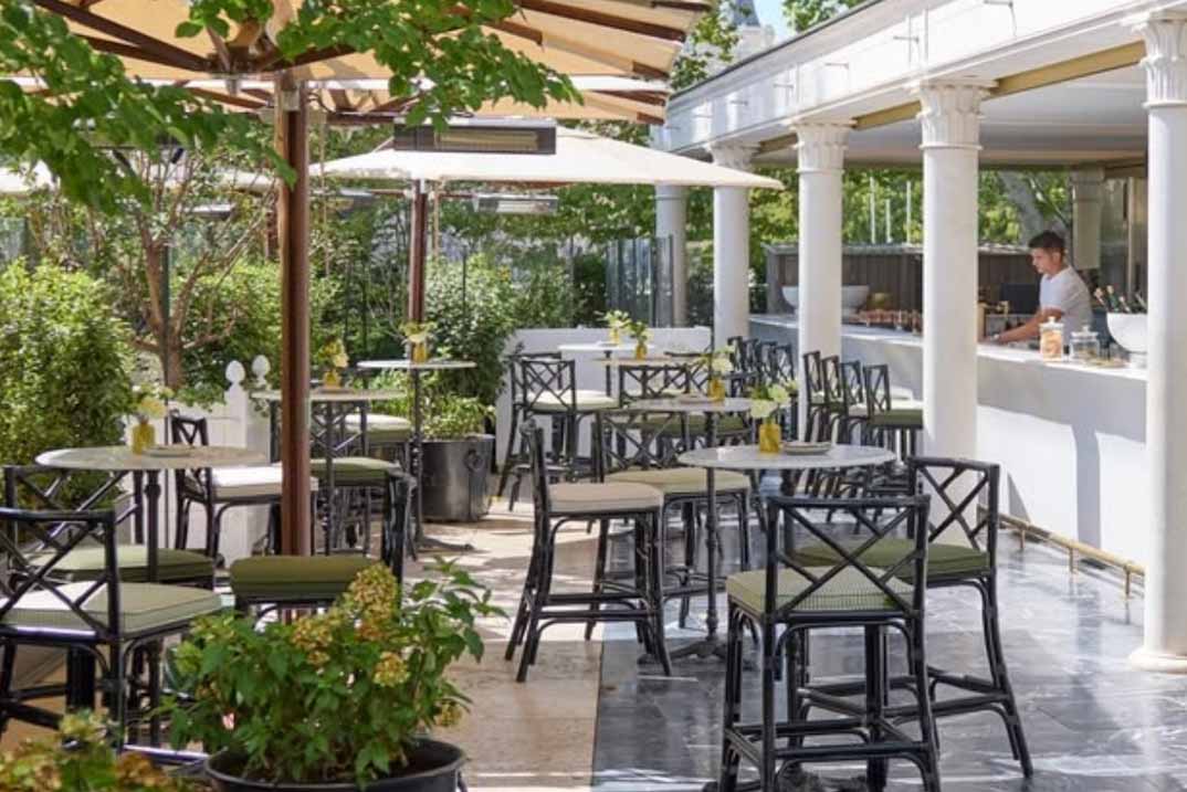 Sus balaustradas blancas, las mesas dispuestas entre árboles centenarios y la atmósfera de calma convierten este jardín en un refugio privilegiado en pleno Paseo del Prado, ideal tanto para un almuerzo entre semana como para una velada bajo las estrellas. Más que una terraza, es una celebración del verano en clave de elegancia y disfrute.