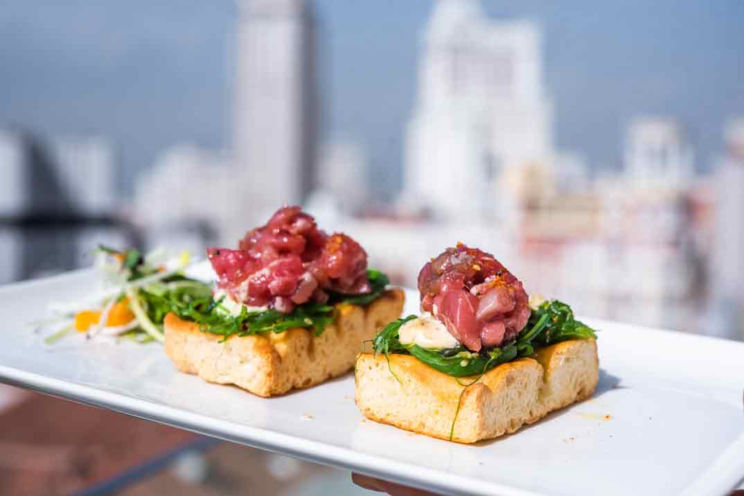 Osadía Lounge & Sky Bar está abierto al público todos los días a partir de las 18 horas –durante el día el acceso es exclusivo para clientes alojados en SmartRental Collection, así como la piscina. Su propuesta gastronómica es como su nombre indica… muy “osada”. Cocina mediterránea, elaborada con producto de proximidad, que busca sabores intensos y especiales… Platos tan originales como la «Falsa tortilla de camarón con gambita roja» o los «Dumpling de rabo de toro con Hoisin».