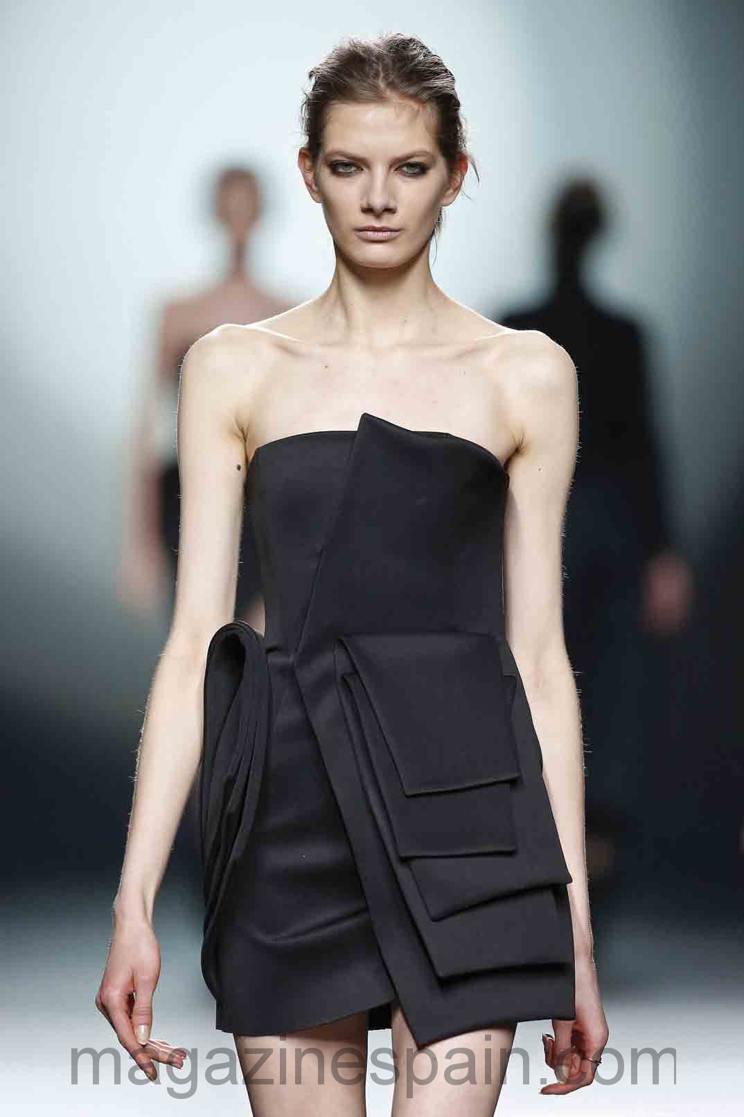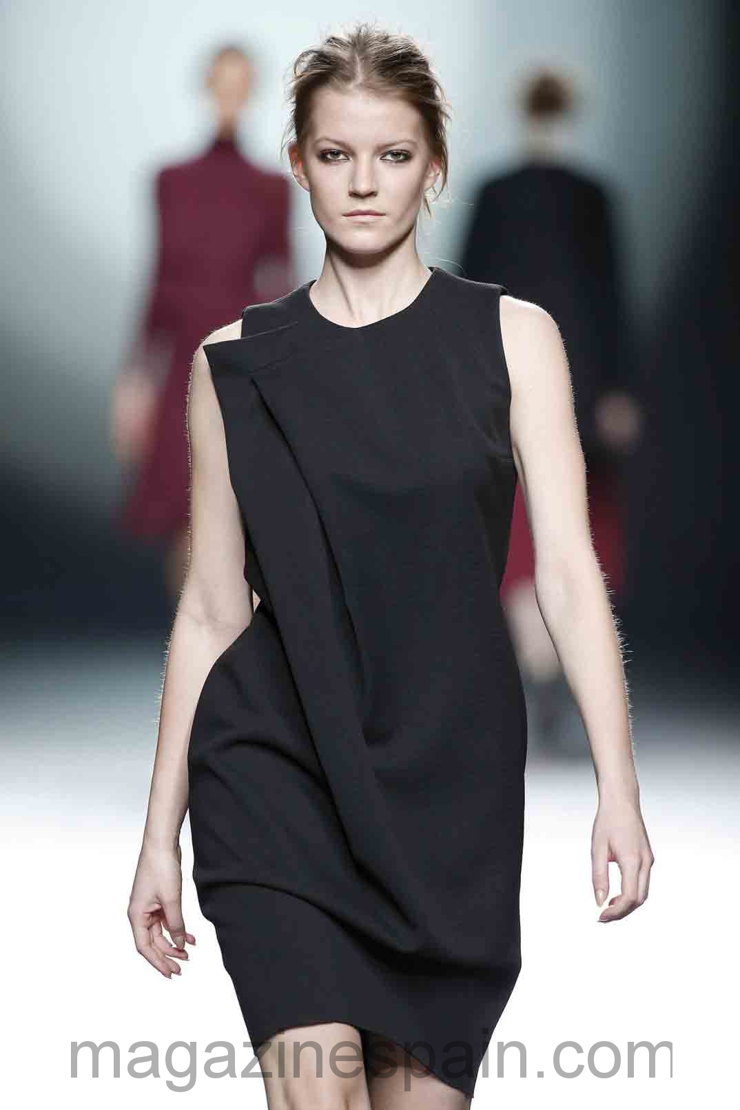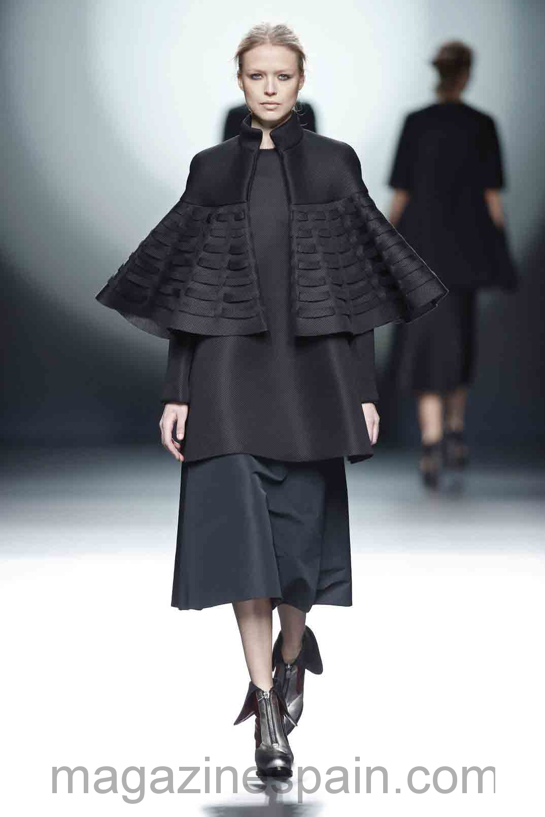 Aunque ella denomina sus tejidos como “falsos lisos”, se aprecia mirando de cerca, que sus vestidos tienen relieve. Amaya ha basado su colección en el color negro, aunque no ha olvidado los colores como, granates, verdes o azules.
