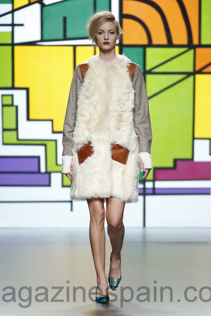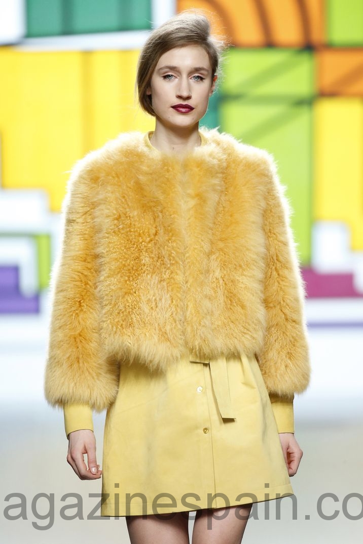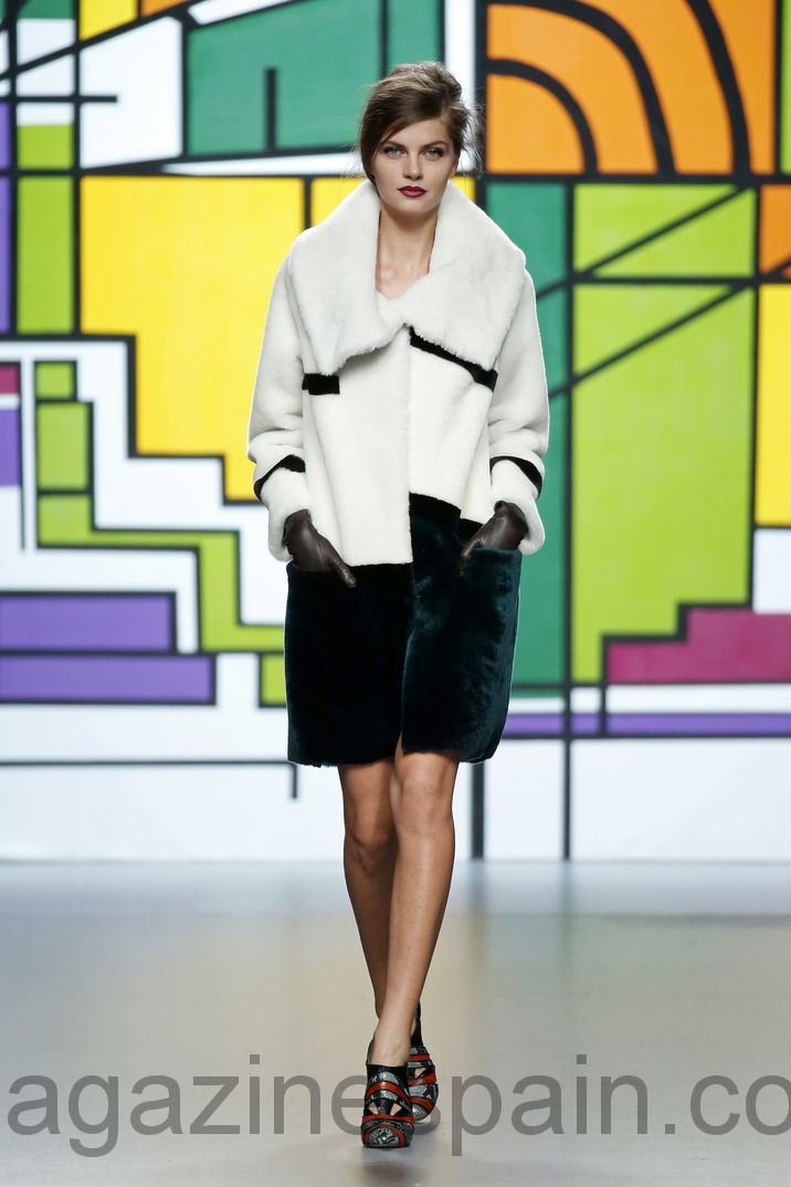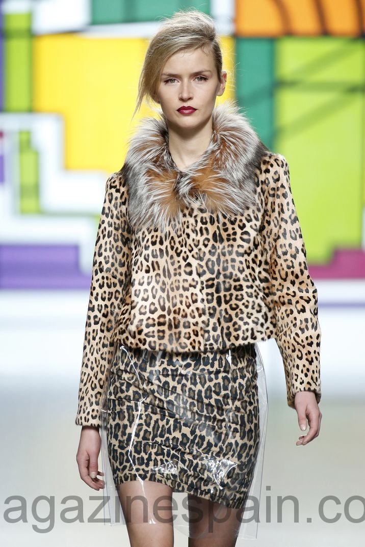 El «print» favorito de su propuesta, «Vanguardia en movimiento», es el leopardo, en varias versiones: chaquetones, faldas, bolsos y cinturones. El cordero merino español y la cachemira o el cuero dorado son otros de los materiales protagonistas de su colección que se complementa a la perfección con los bizarros zapatos de Mónica García.