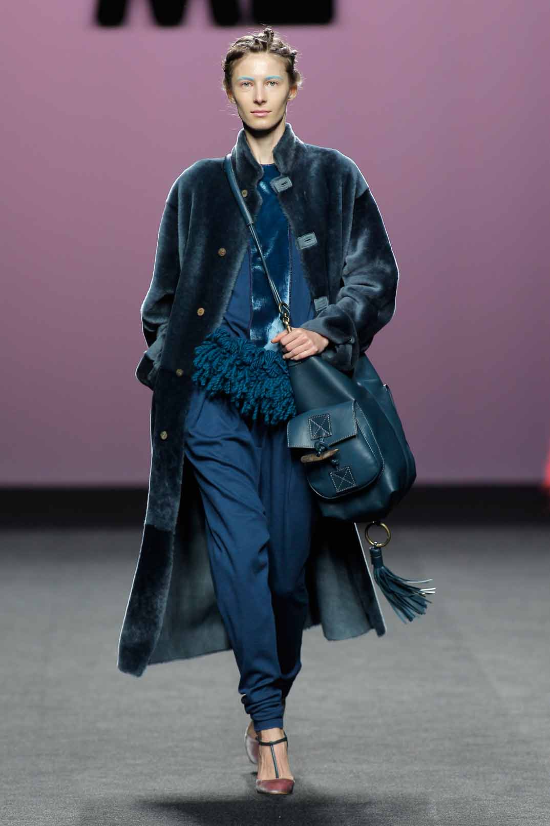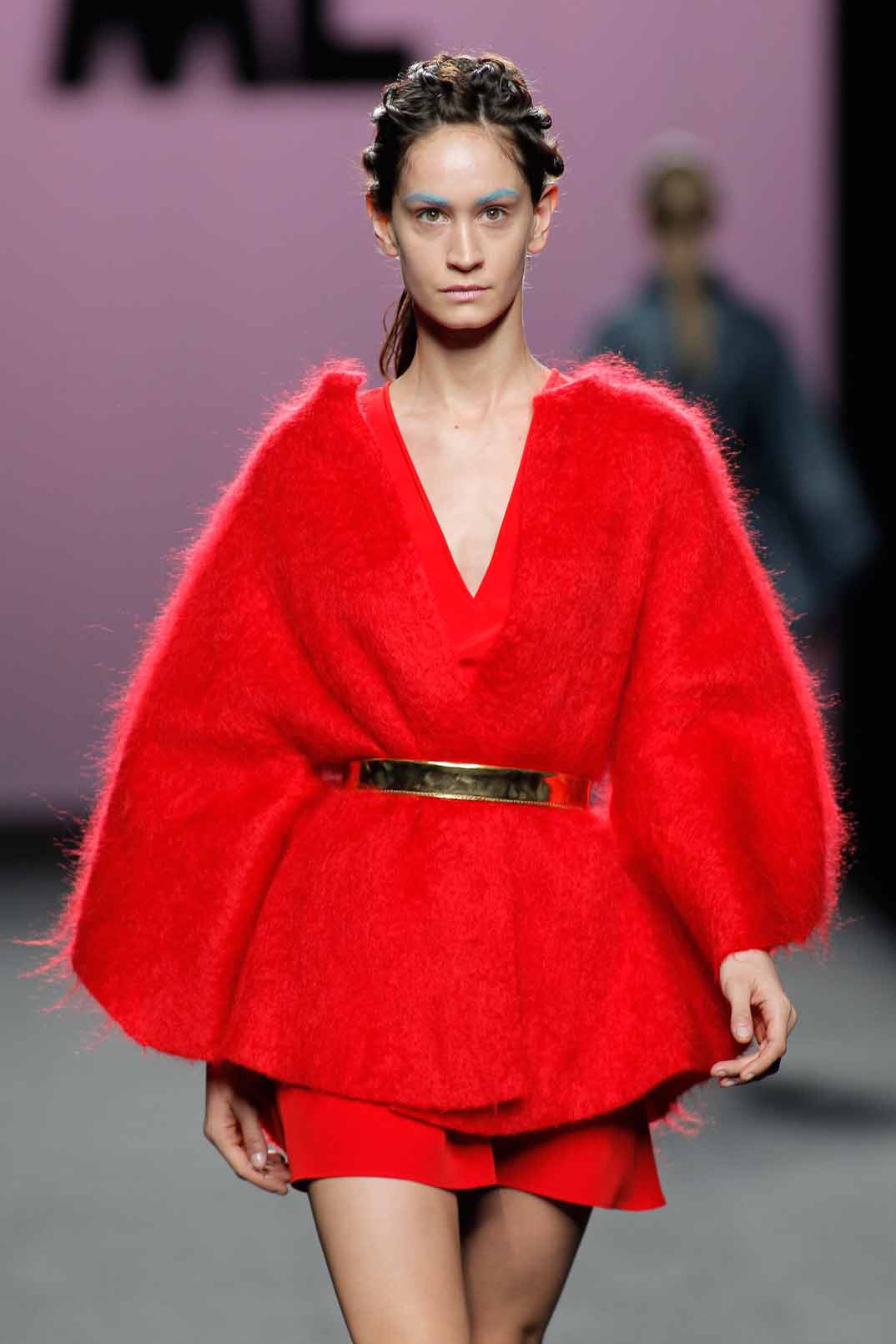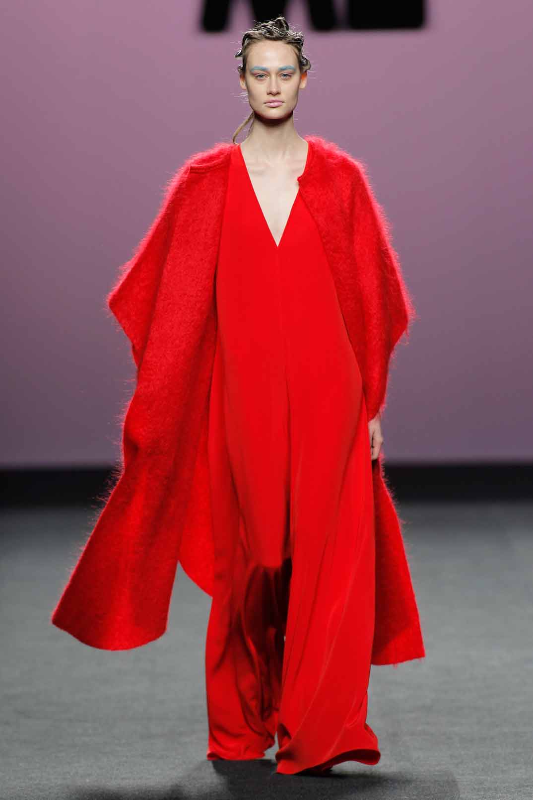 Para el día, Marcos Luengo inventa siluetas que recuerdan, por estilismos y superposición de prendas, a nómadas. Los abrigos, del mismo color que los pantalones y camisas, se expanden en mohair, lana cocina y cordero rizado. Para la noche, la paleta de color vuelve a ser igualmente explosiva en forma de vestidos cóctel con plumas con capas a juego y varios modelos de ‘twill’ elástico de terciopelo.